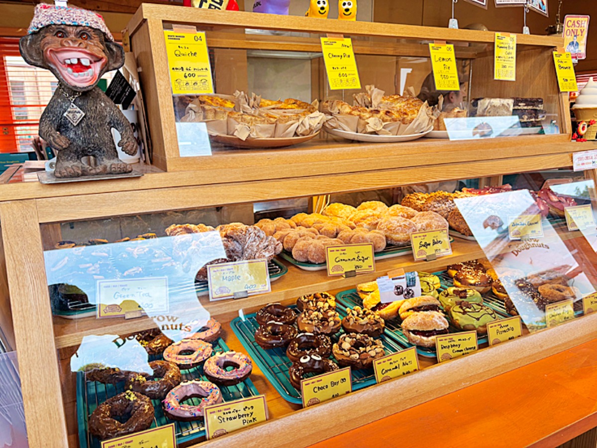 店内に入ると、これまたカラフルポップで可愛いドーナツやパイが並びます。種類も豊富なので、どれを買うか吟味するのも楽しみですね。