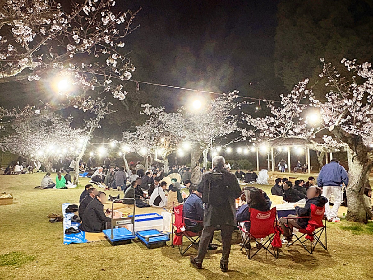 にぎやかに桜やご飯、お喋りを楽しんでいるとあっという間に時間がすぎ、21時頃にはちらほらあちこちのグループで撤収作業が開始。22時には敷地内の提灯なども一斉に消灯され、今日のお花見は無事お開きとなったのでした。