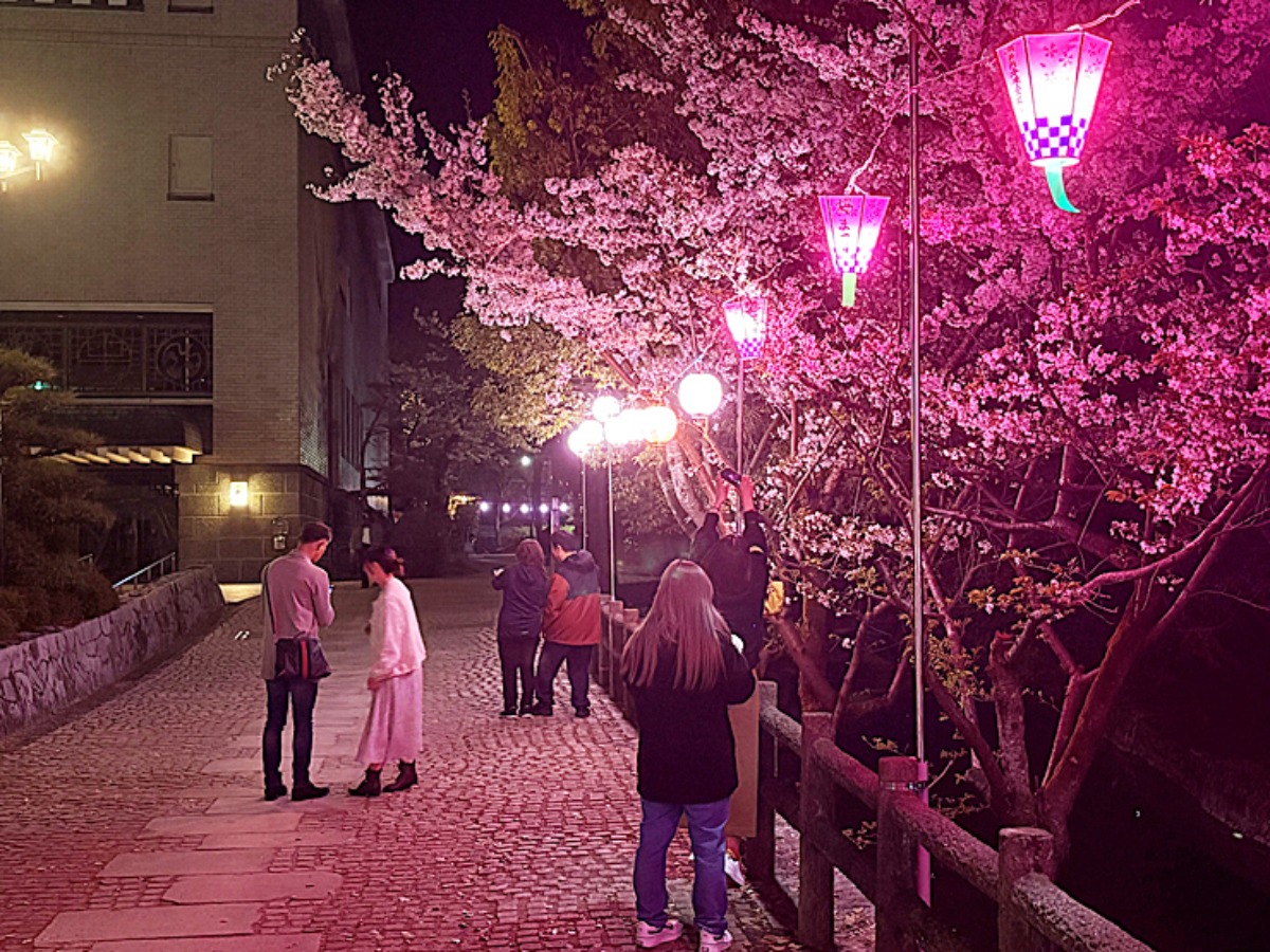小さな子も交えた家族で来ているグループ、おそらく会社の宴会と思しき方々。大学生の大人数グループやカップル、本当に仲のいい子たちだけで来たんだろうな~という数人の女子たち。また鮮やかな夜桜を背景に、写真や動画をたくさん撮っている外国人の方々の姿も見受けられましたよ。