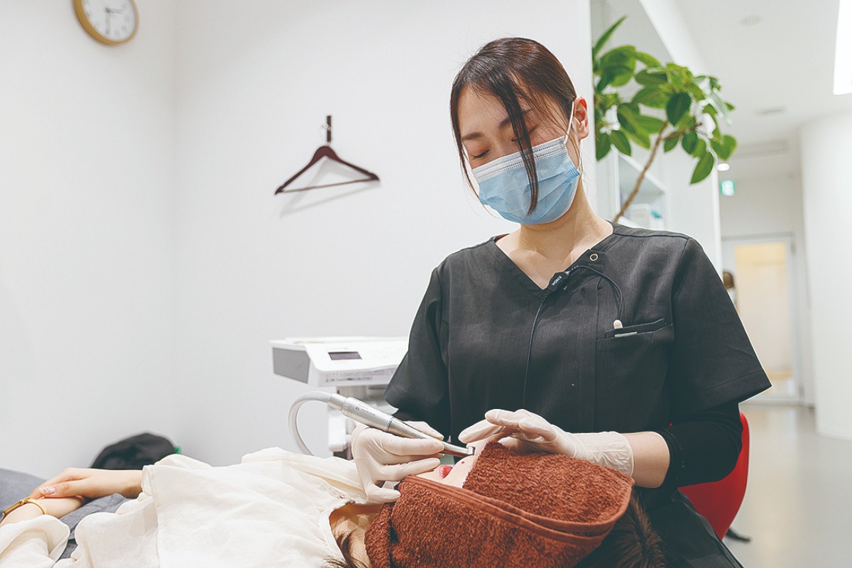 治療前後のビフォーアフター(明るさ比較)チェックや、今後の治療方針の相談・提案を行います。ホームケア希望の方には方法を指導したり、オフィスケア希望の方には次回予約を案内。