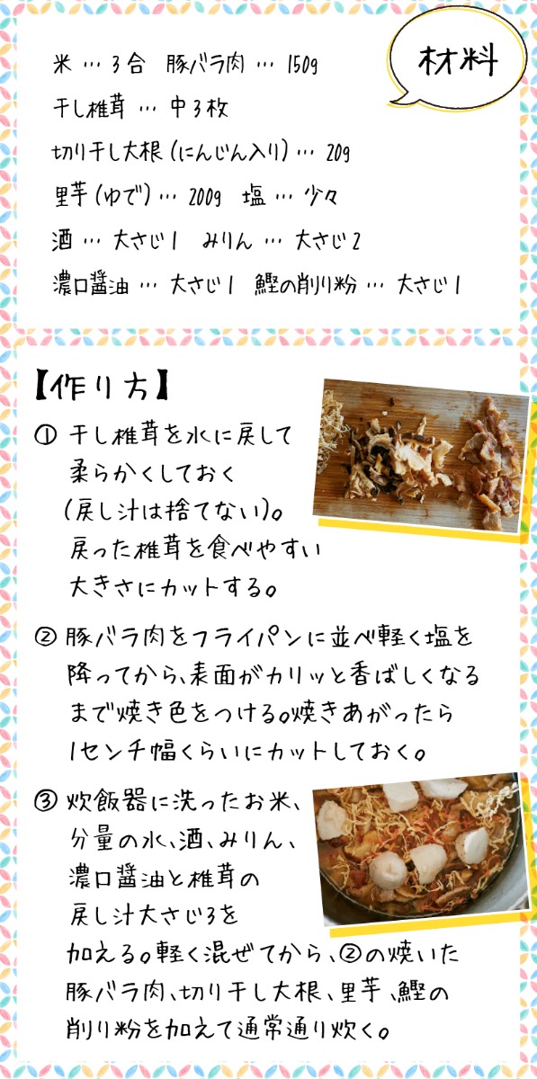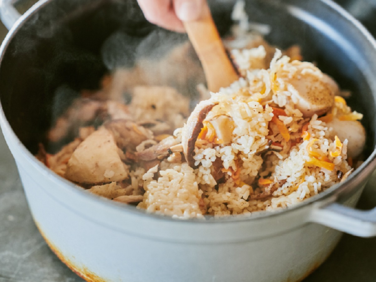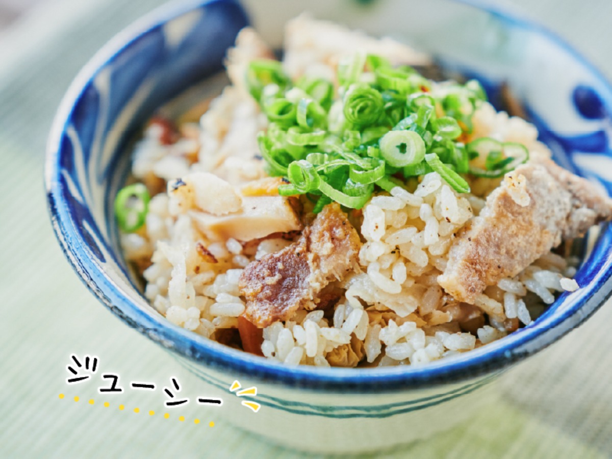 豚肉を日常的に味わう沖縄ならではの、煮汁やだしの旨みを活かした炊き込みご飯が「ジューシー」です。今回は焼いた豚バラ肉を使って手軽にジューシーの風味をプラス。優しい味わいで、野菜もたっぷり食べられる1品でも満足度の高いメニューです。