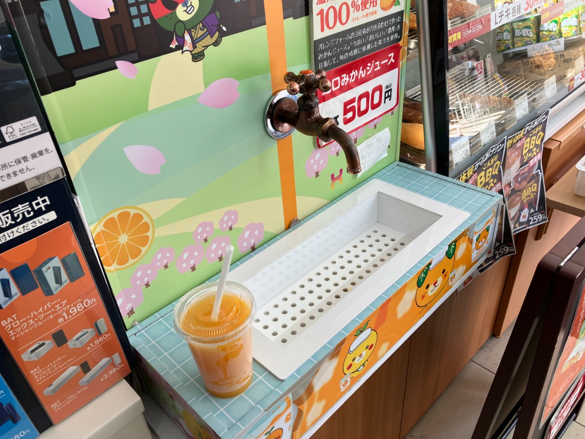 果汁100%・ストレートの愛媛県産温州みかんジュースが蛇口から出てくるのを楽しめる、唯一のコンビニです!