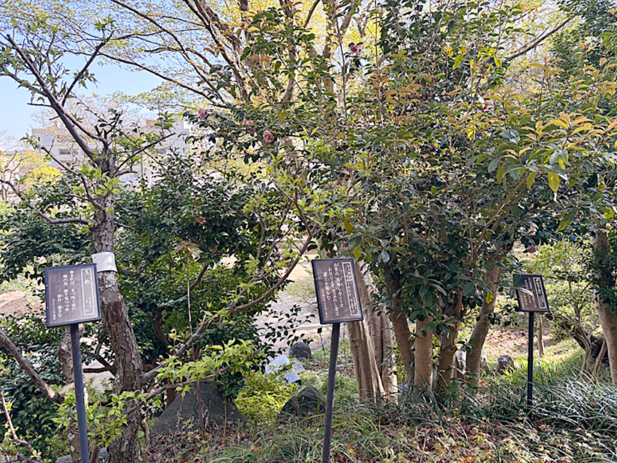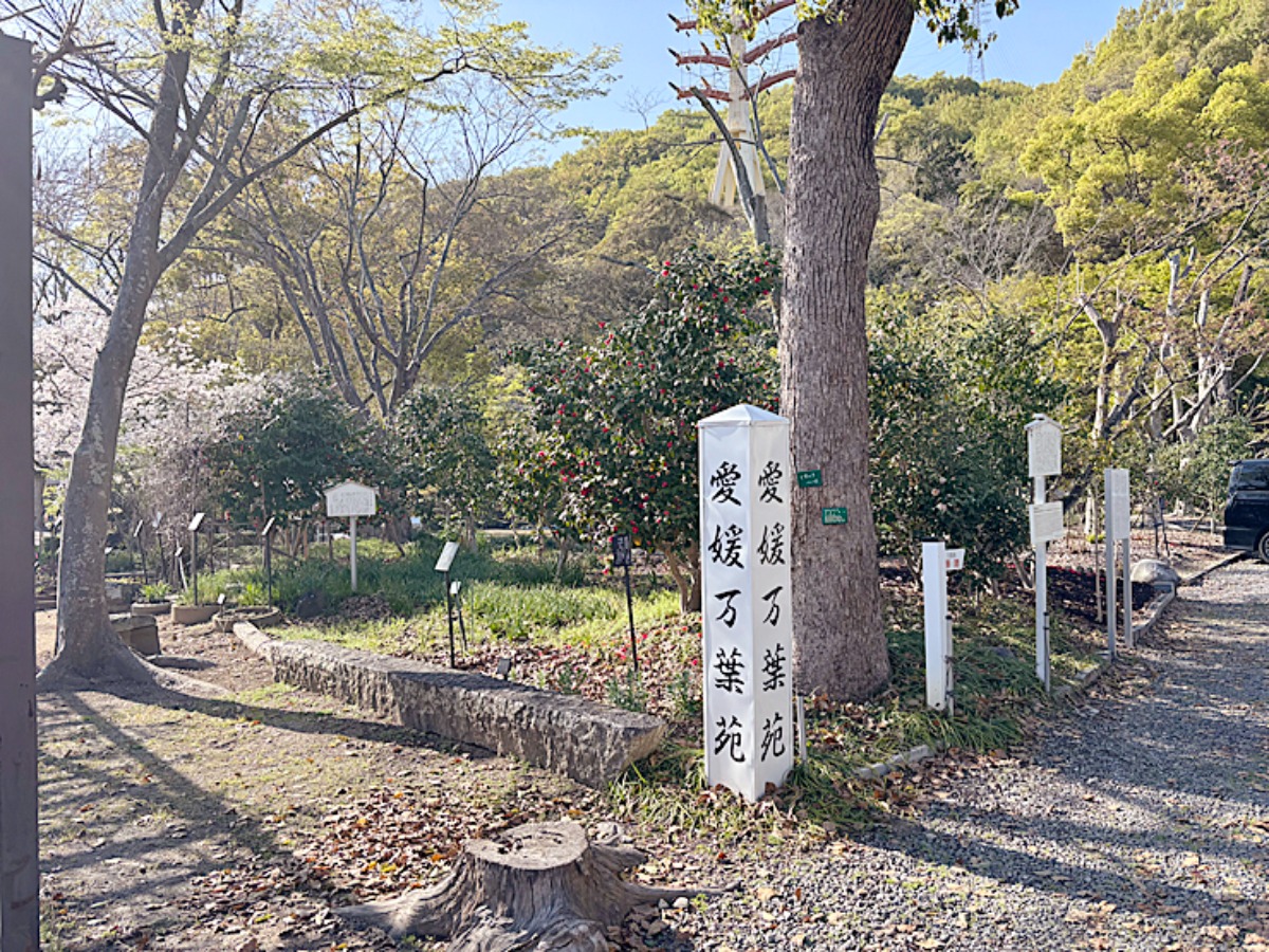 護國神社の魅力は本殿だけじゃないんです。境内西側には、「万葉集」に詠まれた草木が植えられていて、歌碑とともに自然が楽しめる空間「万葉苑」があるんですよ〜。
