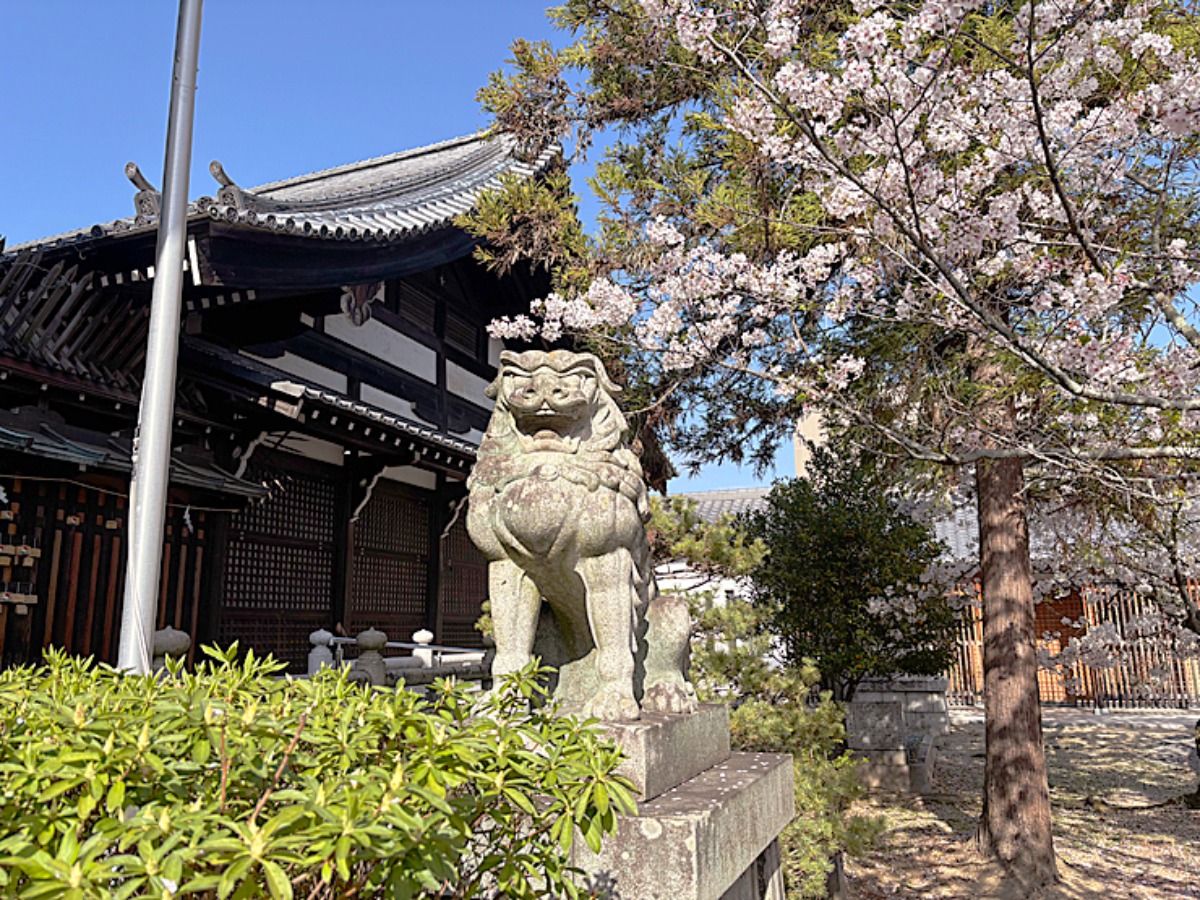 狛犬と桜のコラボレーション。桜が舞い散る中の佇まいについ見惚れてしまいました。