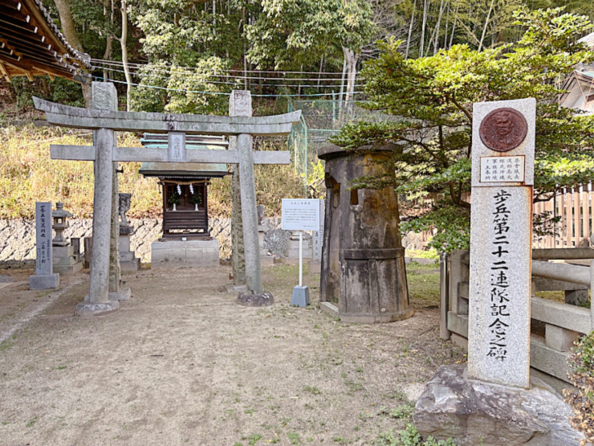 本殿横に、小さな忠魂社が。手前の石柱は、松山歩兵の記念石碑です。