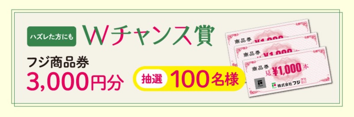 フジ・フジグラン各店(エフ・マルシェ各店、ザ・カジュアル池田店、ラクア緑井も含む)及び専門店にて合計3,000円(税込)以上のお買上げレシートで応募しよう!!