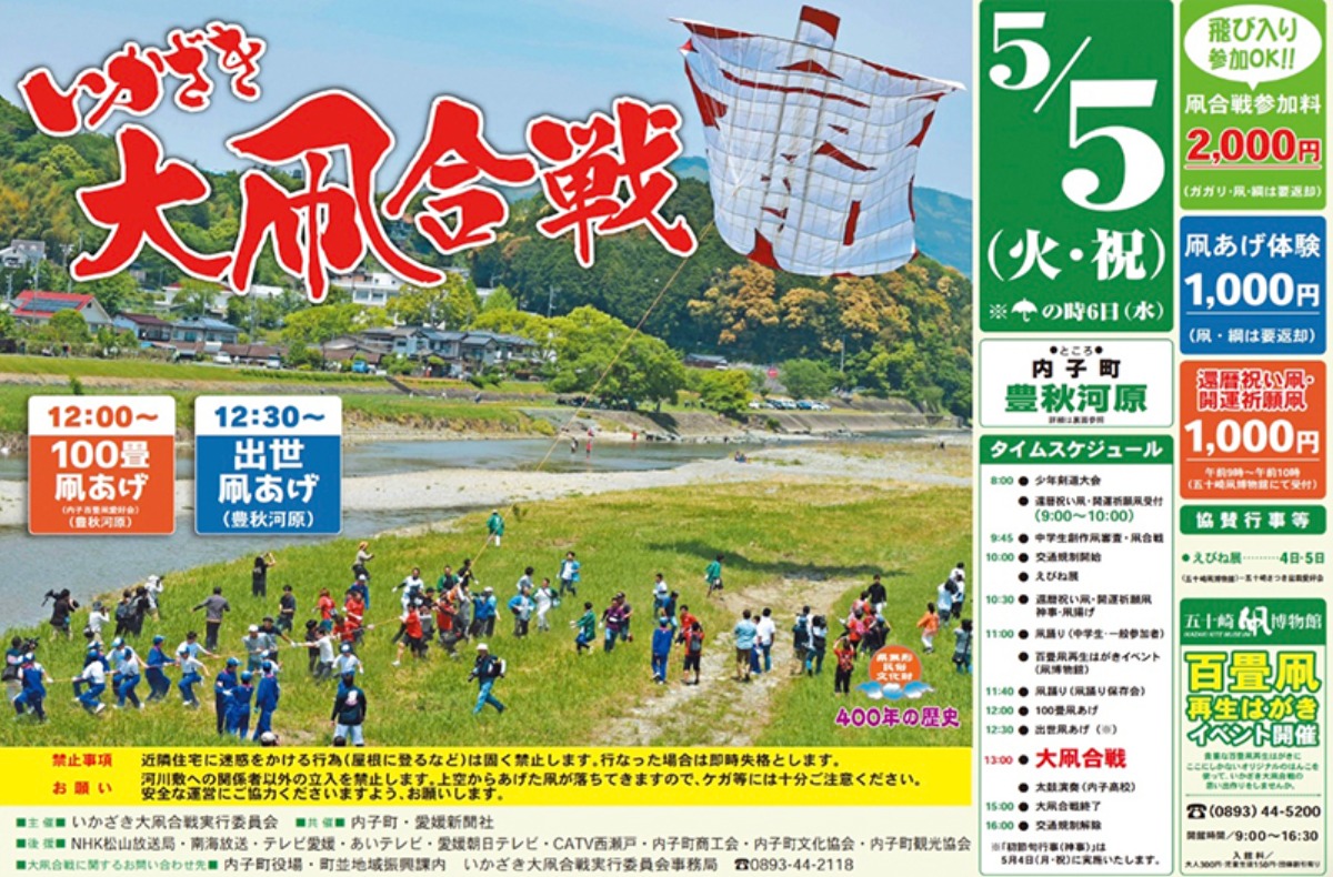 春のレジャーや伝統文化体験としても万人におすすめ、伝統が今なお息づく内子町が贈る「いかざき大凧合戦」にぜひ足を運んでみてくださいね。