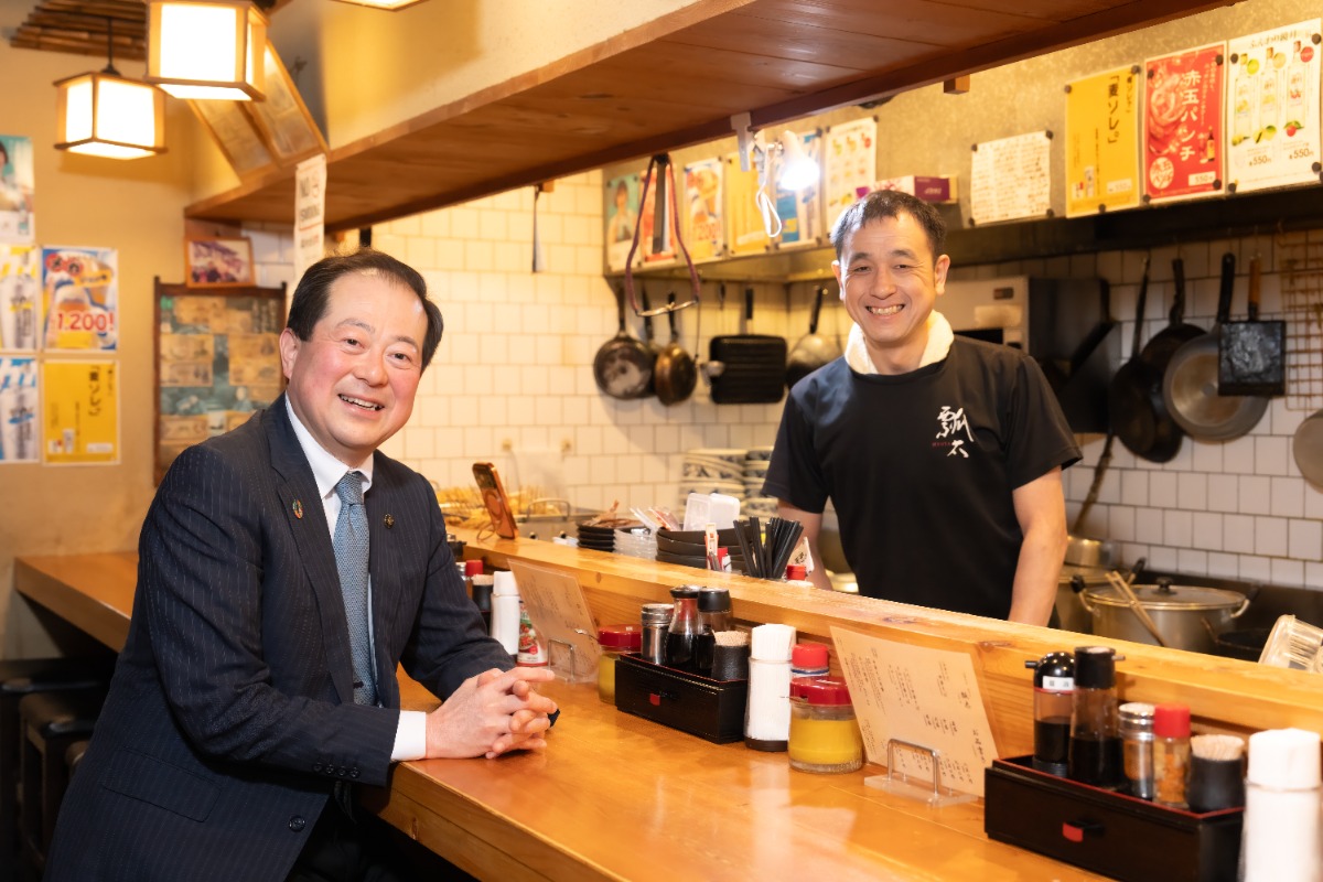 <写真・左>野志 克仁 松山市長 <写真・右>瓢太 店主 加藤 大さん