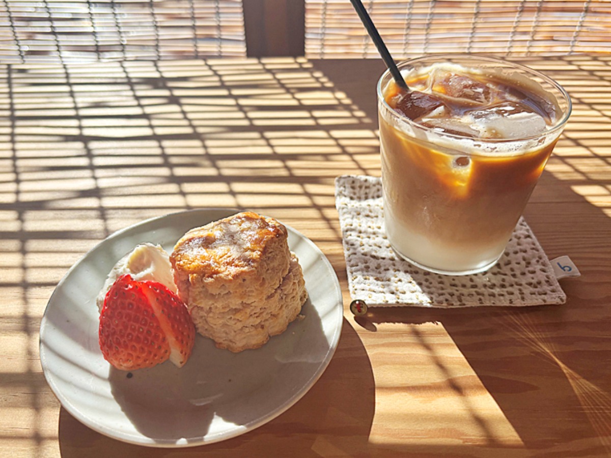 光の関係で少し見づらいですが、今回私は「アイスカフェオレ・エアロプレス」(650円)と、「いちごのスコーン」(400円)をチョイス。