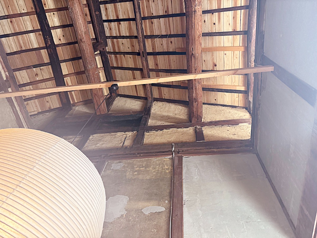 上を見上げると、土壁や梁がしっかり見えます。築120年以上の古民家、と言われて納得の貫禄ですね。