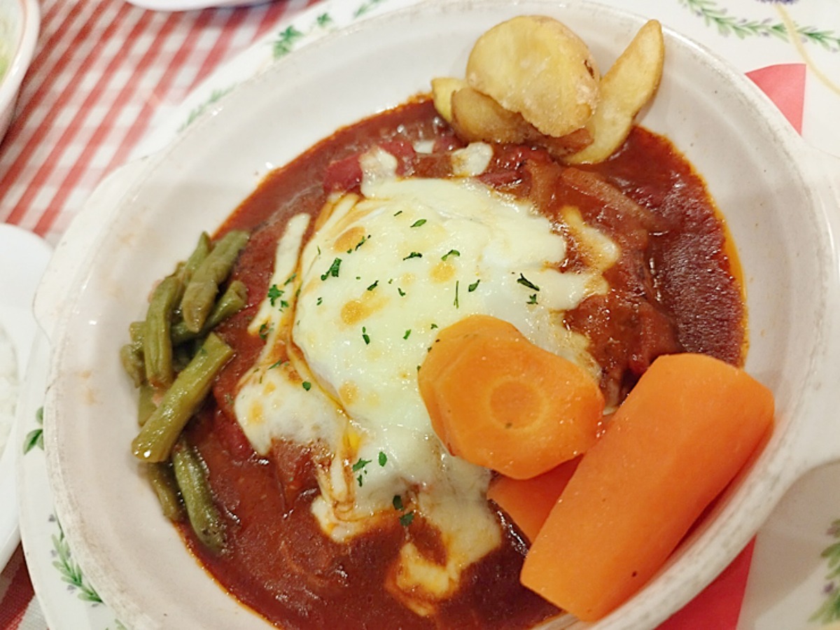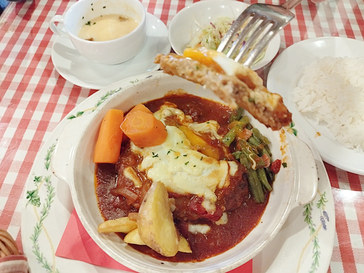 圧巻のボリュームを誇る煮込みハンバーグステーキオーブン焼きが目の前に現れると、魅惑のチーズがたっぷりかかった美しいフォルムに感動すら覚えます。