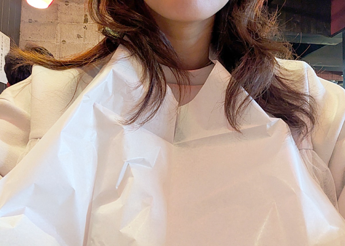 スープが飛び散ったらいけないからと、店員さんが紙エプロンを持ってきてくれました。