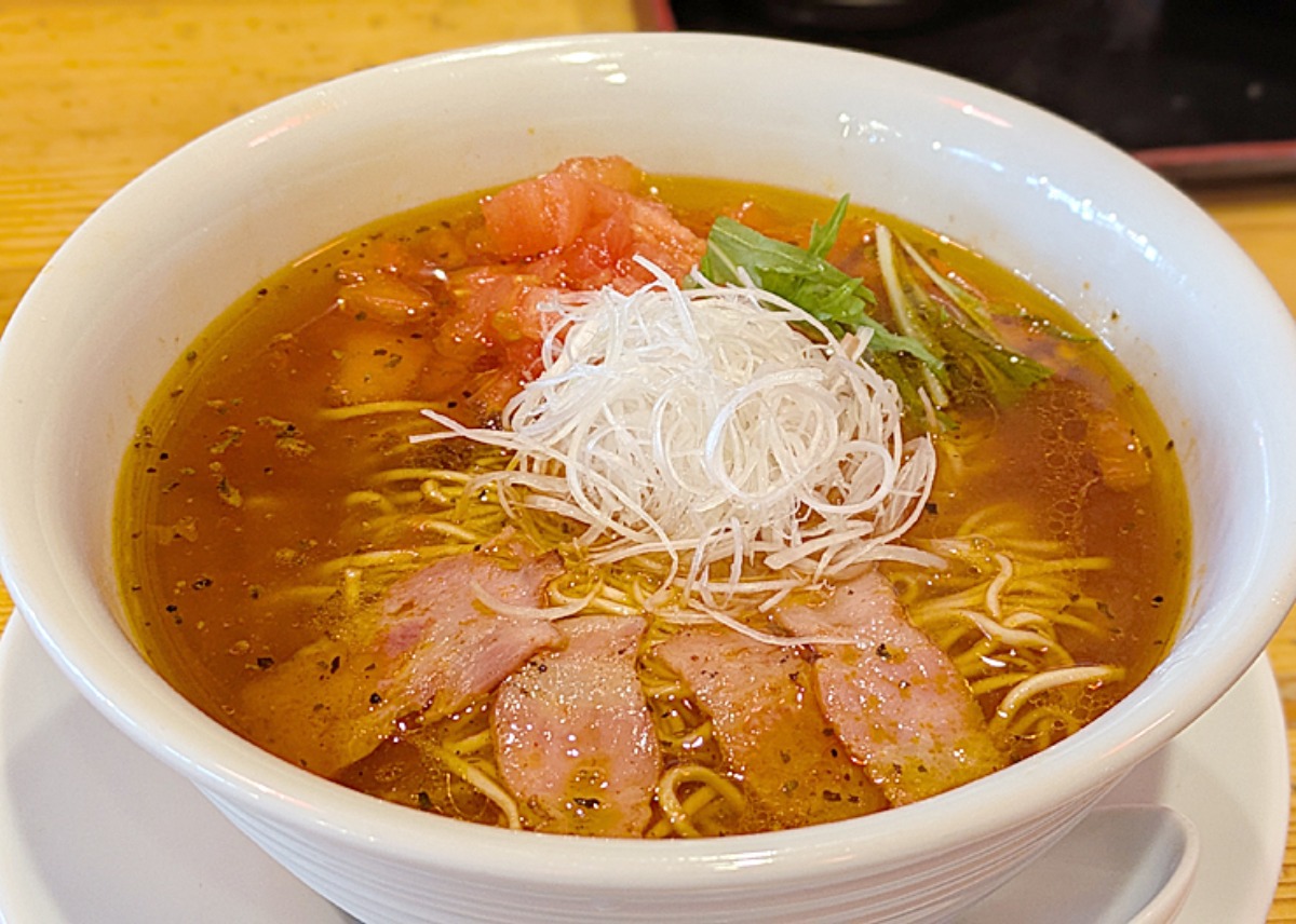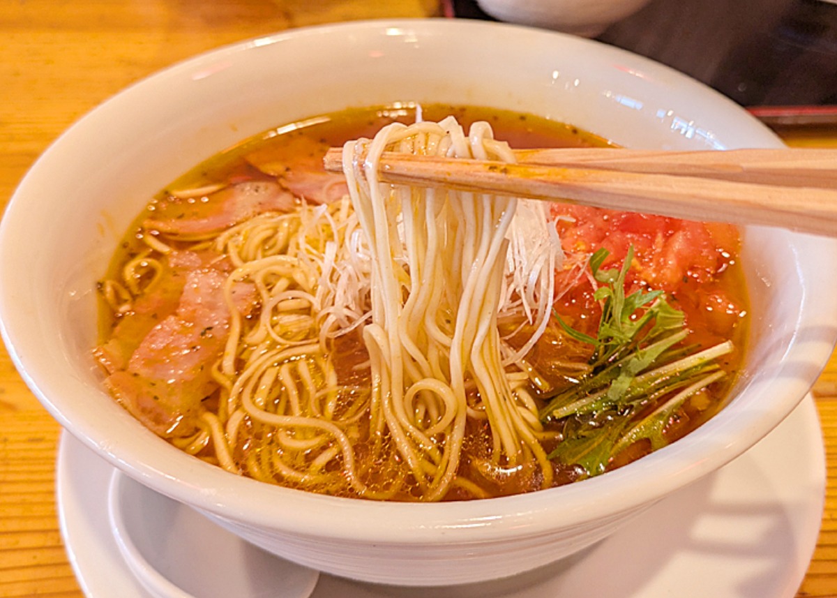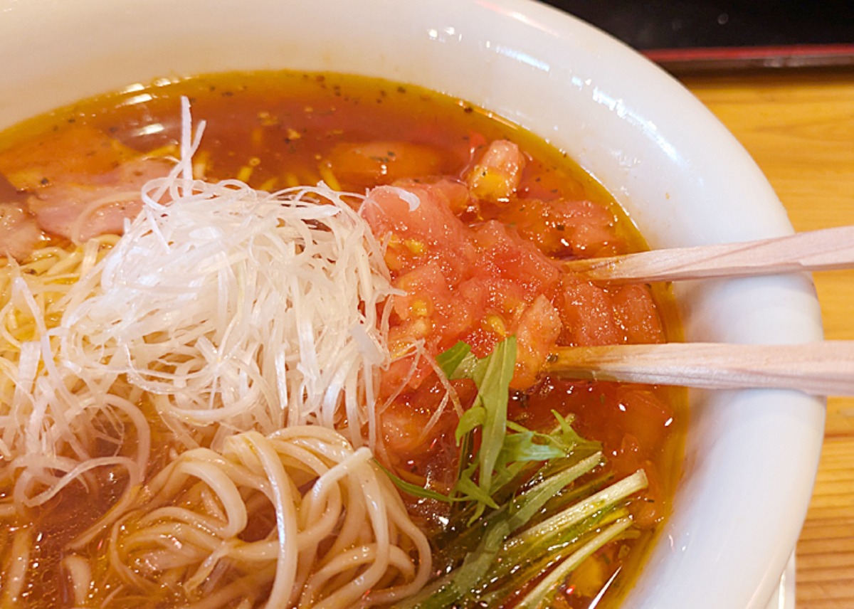 トマトもたっぷり。見た目はラーメンなのですが、味はパスタを食べているようで、不思議な感覚に。