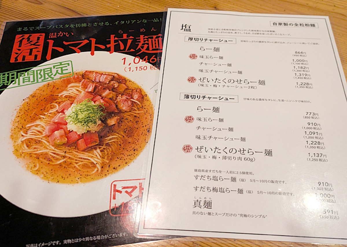 今回は旦那おすすめのつけ麺にしようと思っていたんですが…気になったのが、期間限定の「トマト拉麺」。私、こういう「期間限定」っていう言葉に弱いんです。