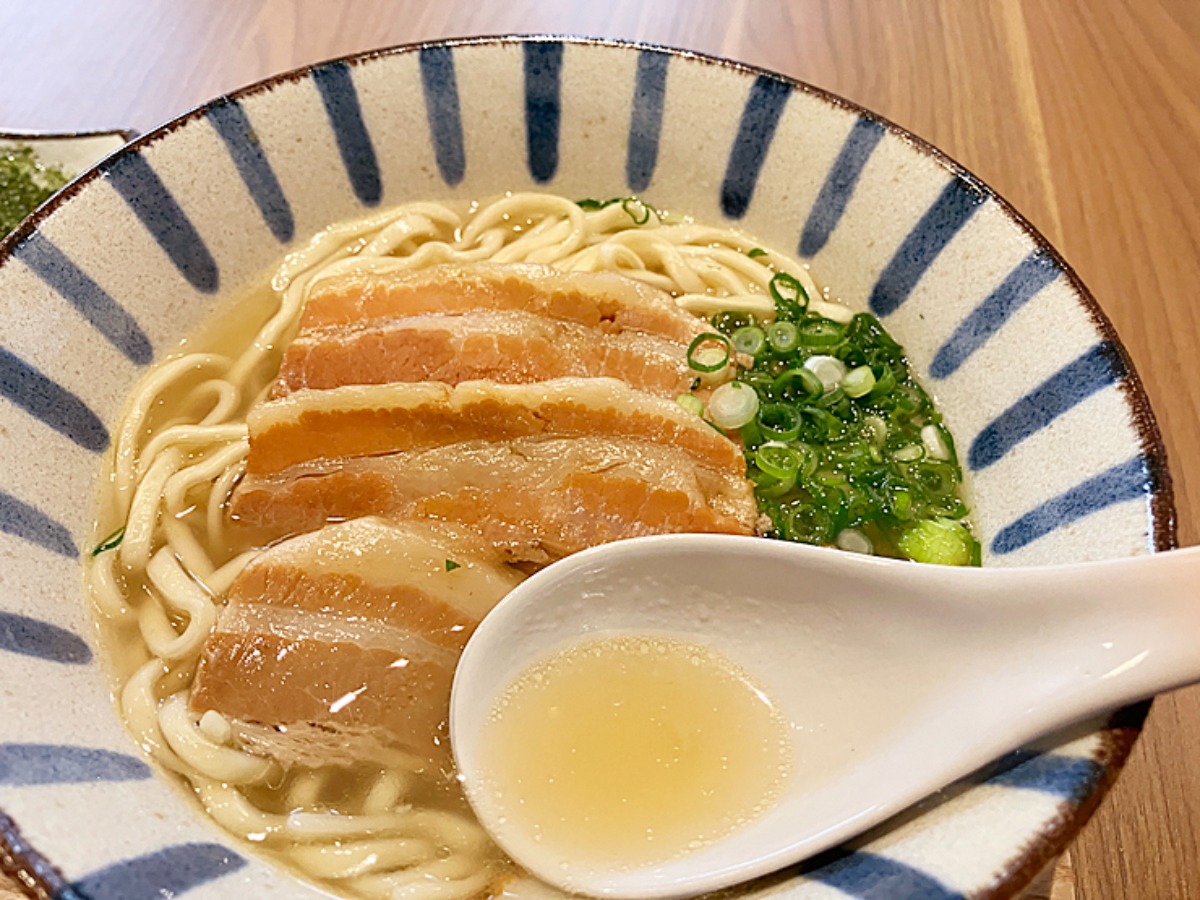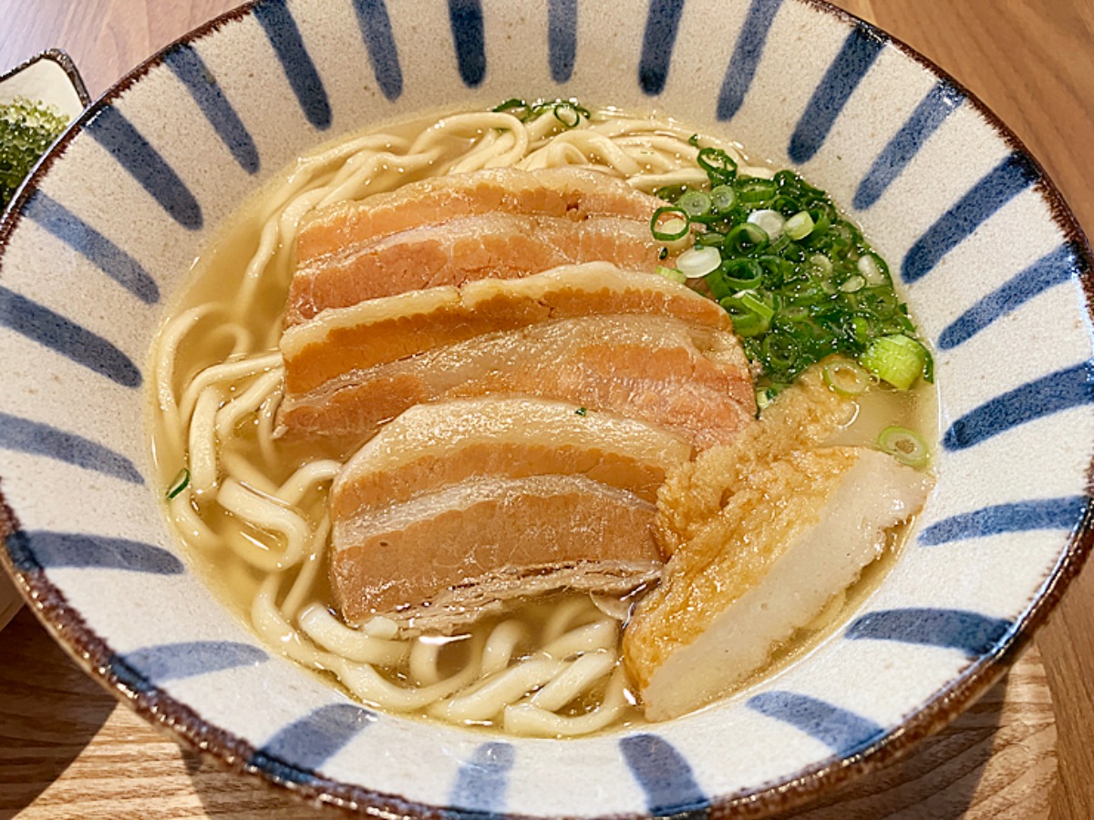 沖縄そばは、うどんより細いストレート麺。 スープは、豚とかつおをベースにしていて、あっさりしつつ、コクのあるやさしい味でした。甘辛く煮た豚肉は、トロトロでおいしかったです。