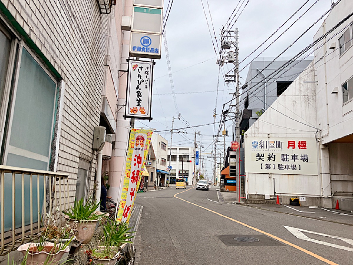 「沖縄そばの店 さんぴん食堂」は、伊予西条駅から徒歩約15分。紺屋町商店街近くにあります。