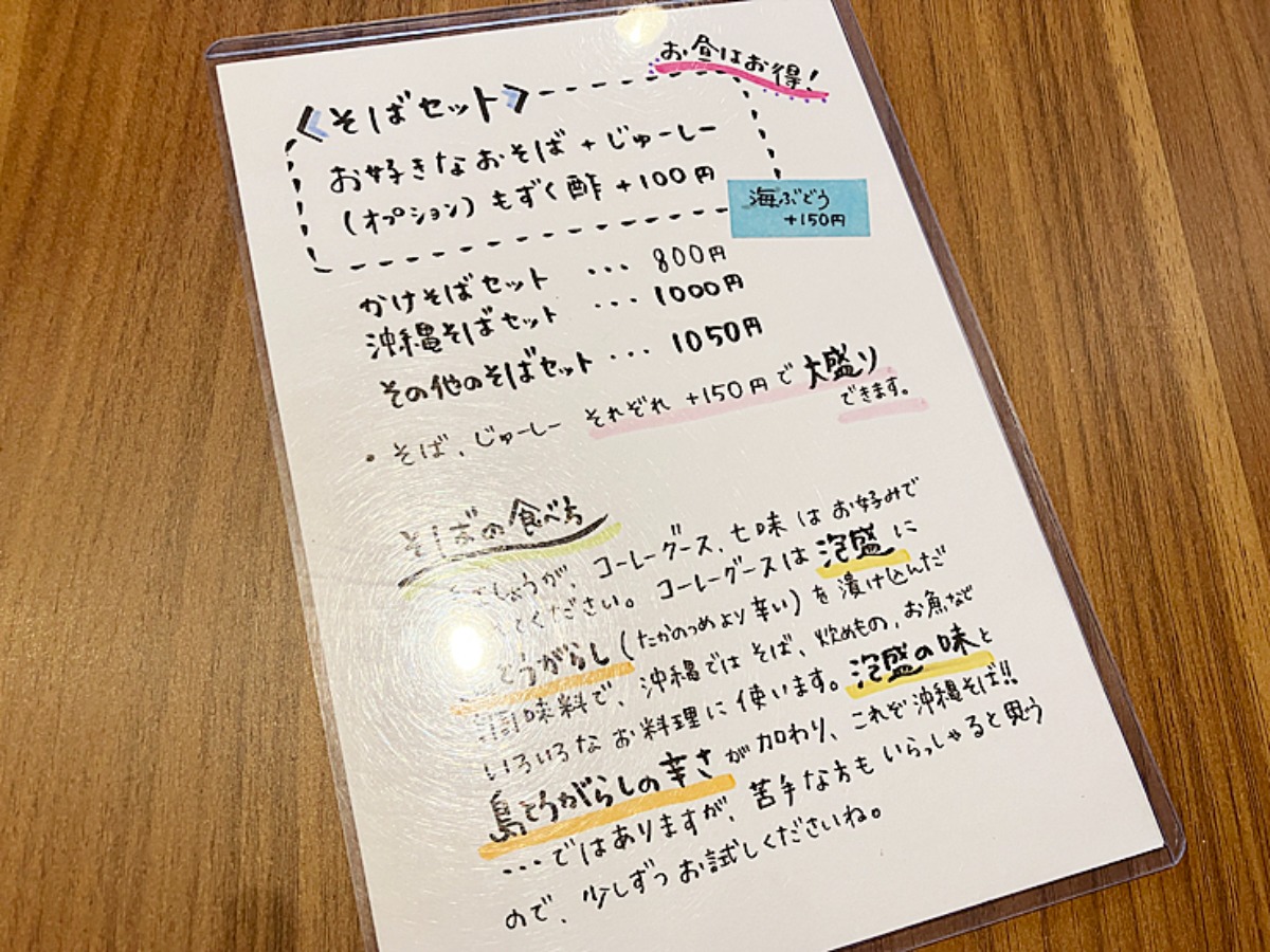お品書きを見ると、お昼はお得な「そばセット」がありました。お好きなおそばに「じゅーしー」がついたセットです。