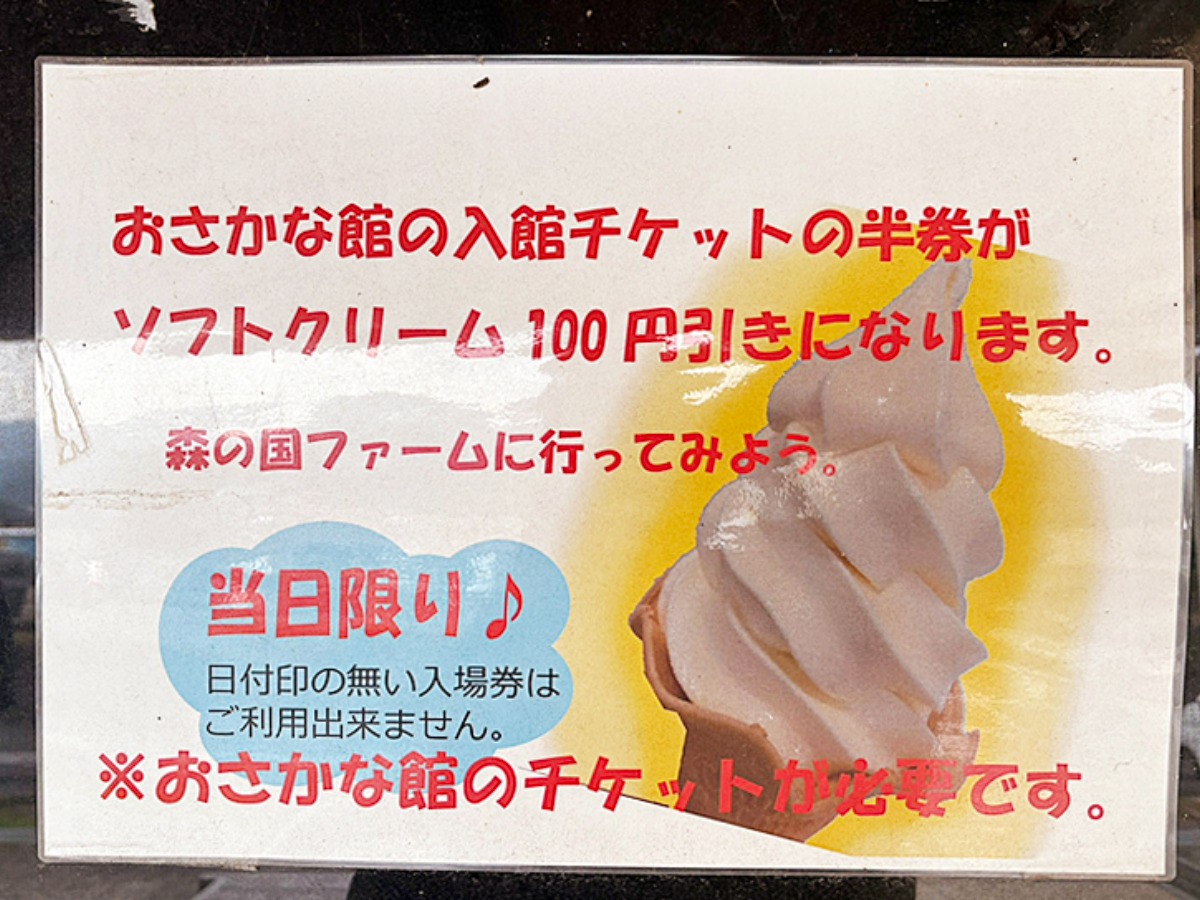 おさかな館を利用すると、実はちょっと嬉しい特典も。当日のおさかな館の半券を持参すると、森の国ファームのソフトクリームが100円引きになるんです♪遊び終わりのご褒美にぴったりで、我が家もしっかり利用してきました♪