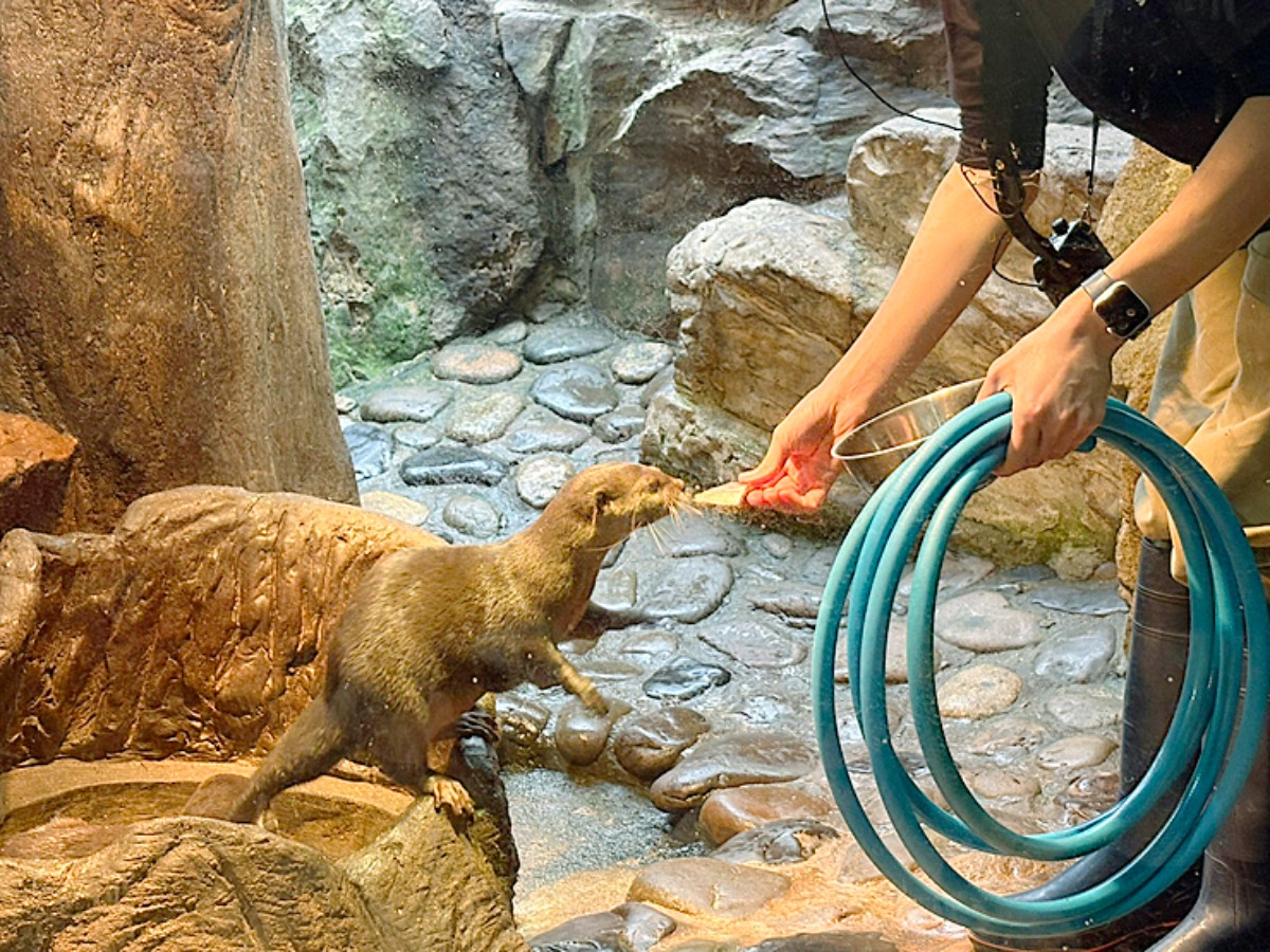 カワウソのご飯タイムの見学では、ちょっと変わったスタイルも。魚以外にもキャットフードを与えていたのですが、あえていろんな場所に置いて、カワウソたちがそれを探しながら食べていたんです。