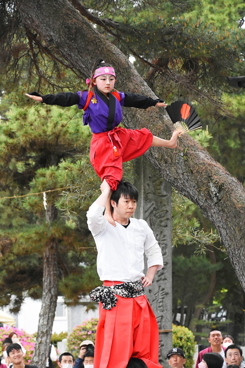 伊勢神宮の神楽をルーツに、300年以上もの長い歴史を持つこの伝統芸能は、太鼓のリズムとともに、子どもたちが獅子頭をかぶりながら人の肩の上へと積み重なっていくダイナミックな舞が特徴です。
