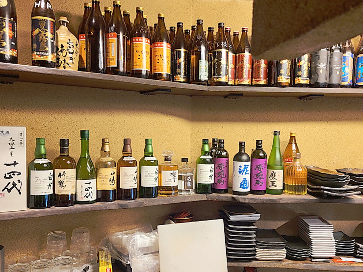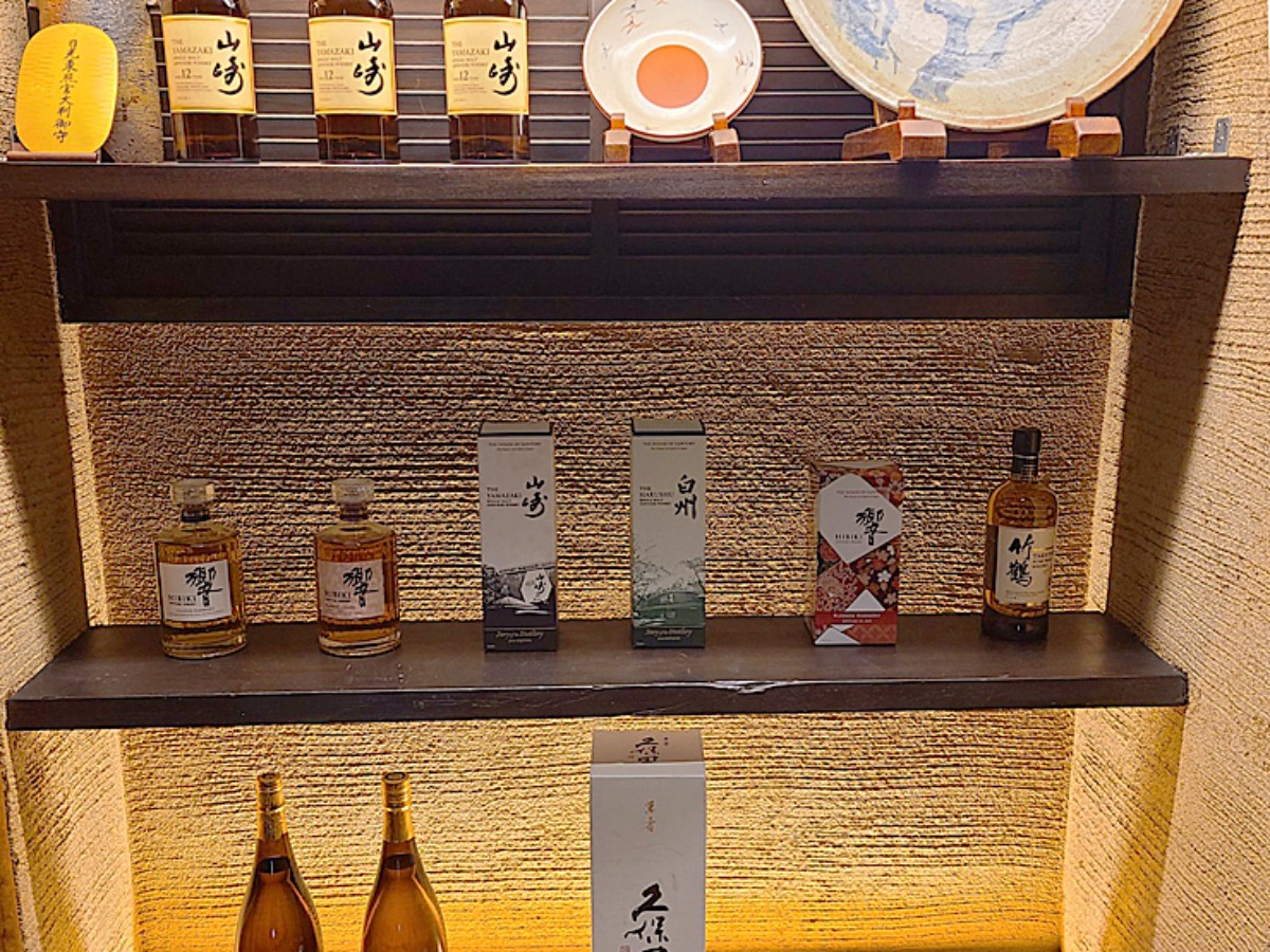たとえば、白州や山崎、竹鶴といった人気のウイスキーが1杯1,000円で味わえるほか、響や竹鶴、久保田、魔王など、幅広いジャンルの銘酒が揃っています。さらに、山崎12年といった希少な銘柄も取り扱っており、お酒好きにはたまらないラインナップ♪