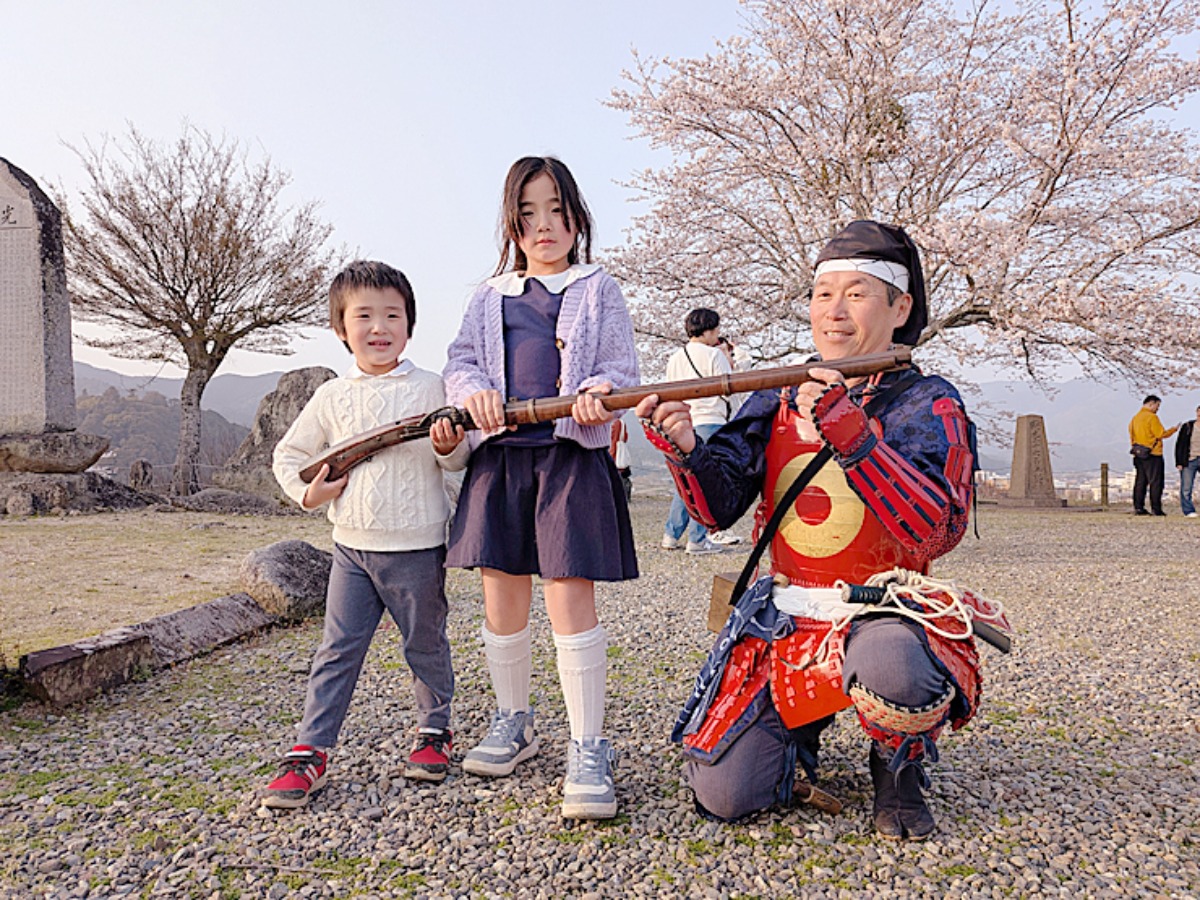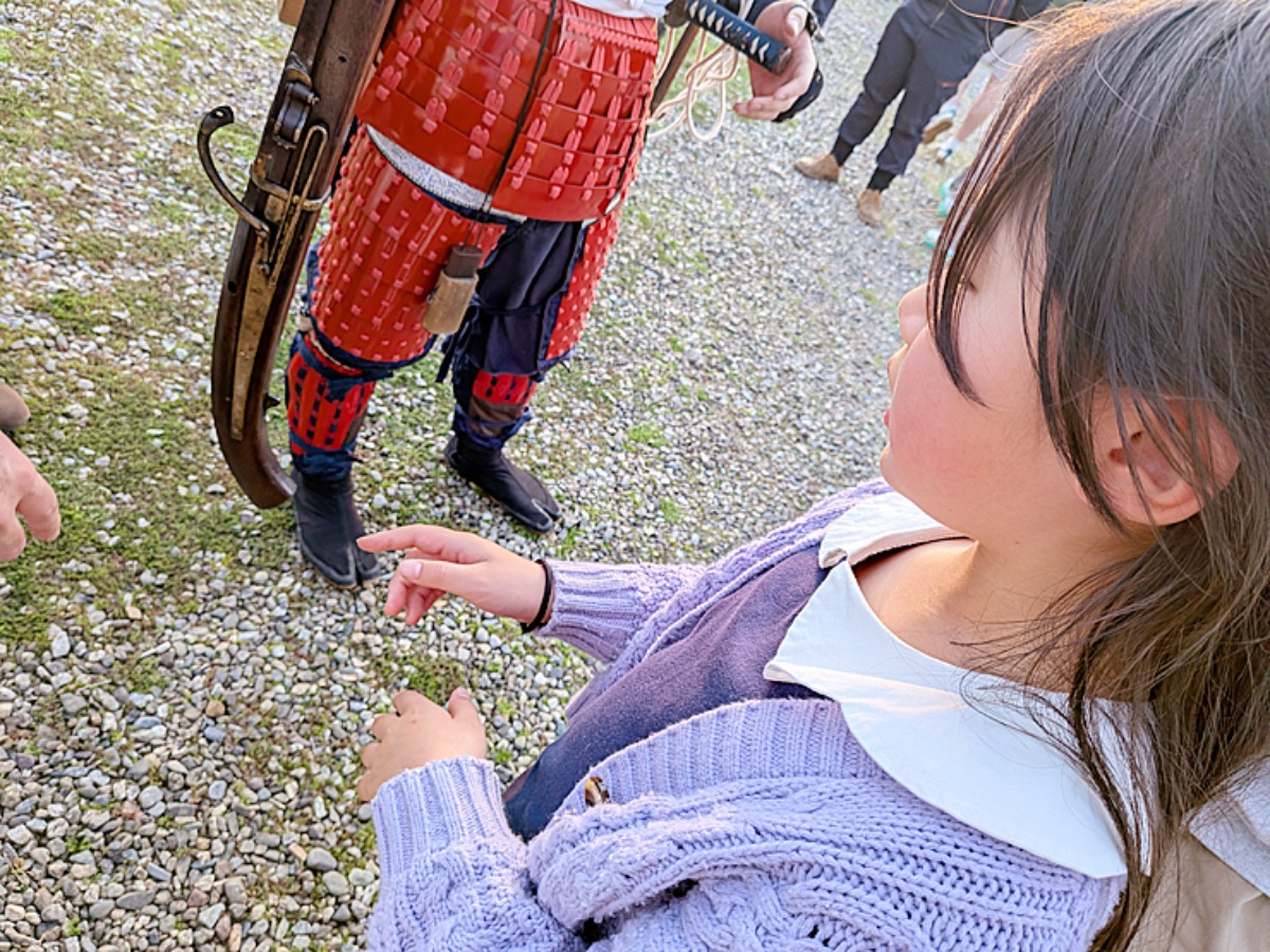 掛け声とともに放たれた火縄銃の音は想像以上の迫力でした。息子は耳をふさいで少し怖がっていましたが、演武が終わった後、実際に銃を触らせてもらうと一転、大喜び。