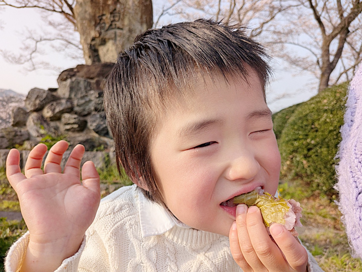 嬉しそうに桜餅をガブリ。