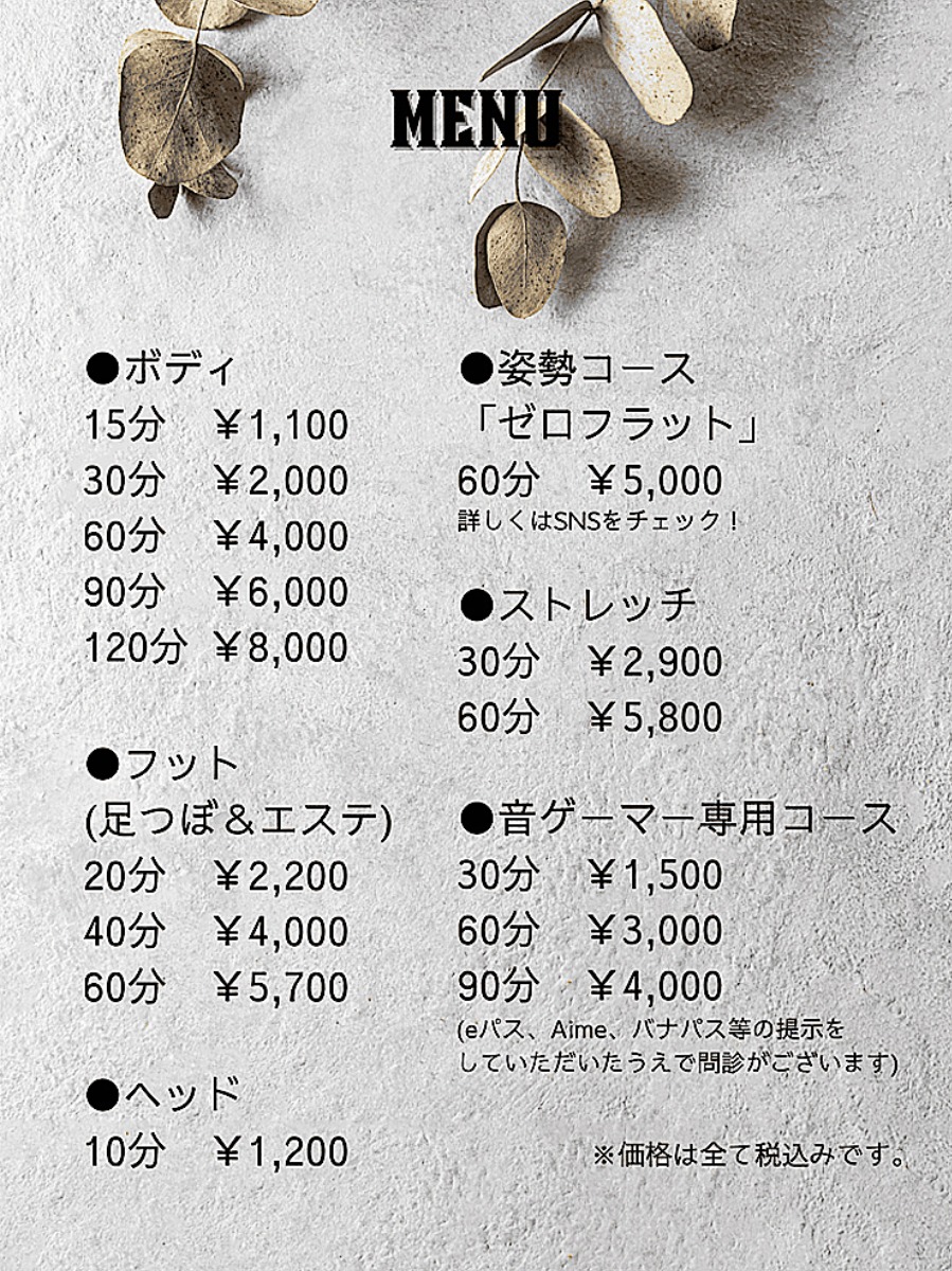 メニュー表を見てみると、ボディやフット、ヘッドなど様々なコースが用意されています。