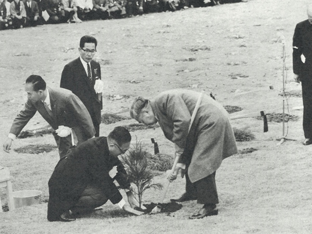 「60年前の第17回大会でお手植えされる昭和天皇、香淳皇后」