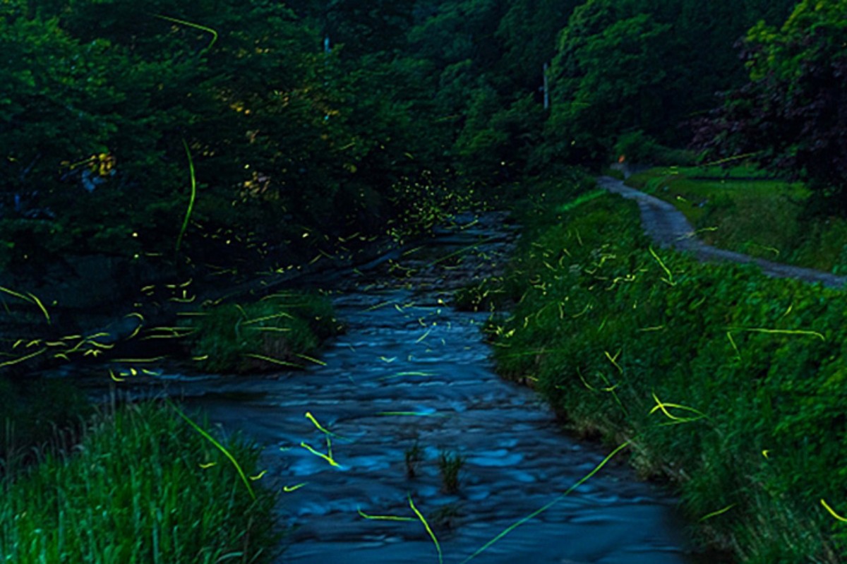 澄んだ空気と静かな川の音、そして星空の下に舞うホタルたちの光が織りなす、幻想的な景色。