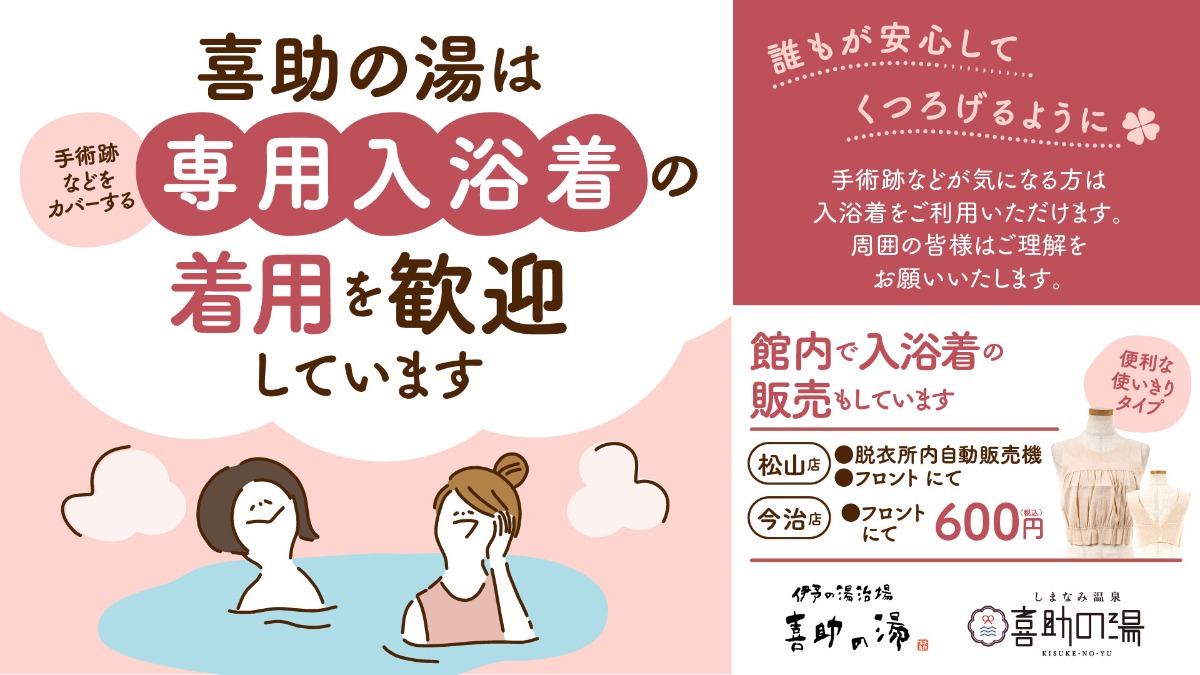 松山市の「伊予の湯治場 喜助の湯」と今治市の「しまなみ温泉 喜助の湯」を運営するキスケ株式会社は、すべての人が安心して入浴できる環境づくりの一環として、専用入浴着の着用を歓迎するとともに来館する利用者にも理解と協力を呼びかけています。