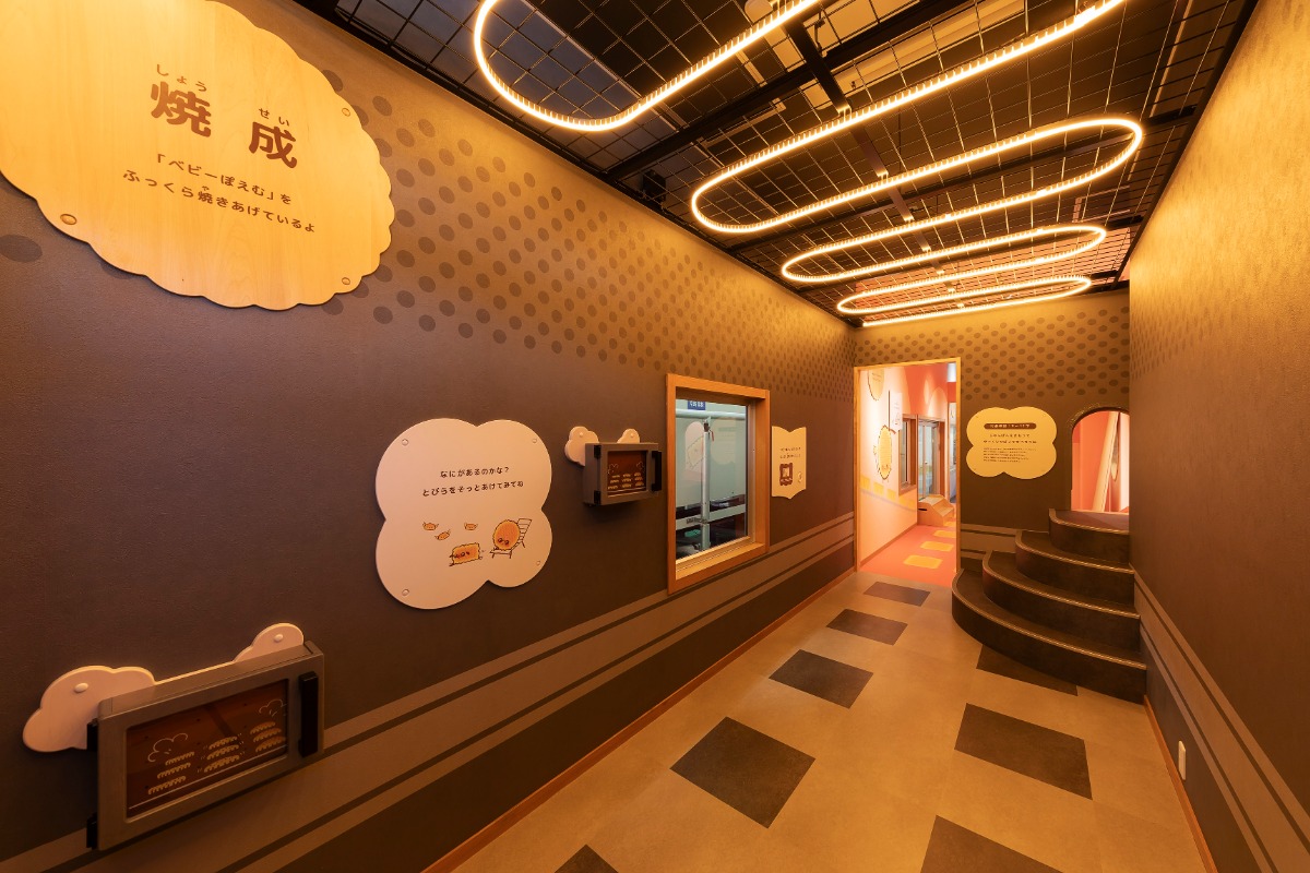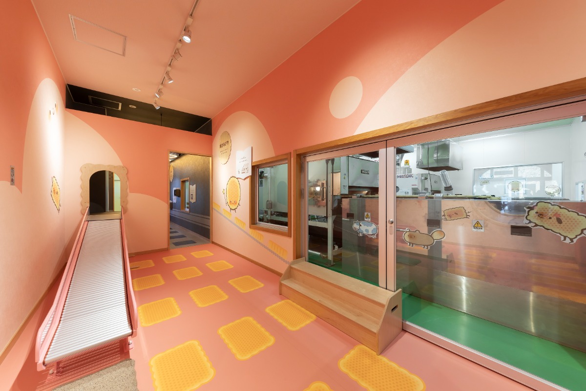 母恵夢スイーツパークの魅力は、「母恵夢になろう!」をテーマにしたポップでかわいい工場見学通路!