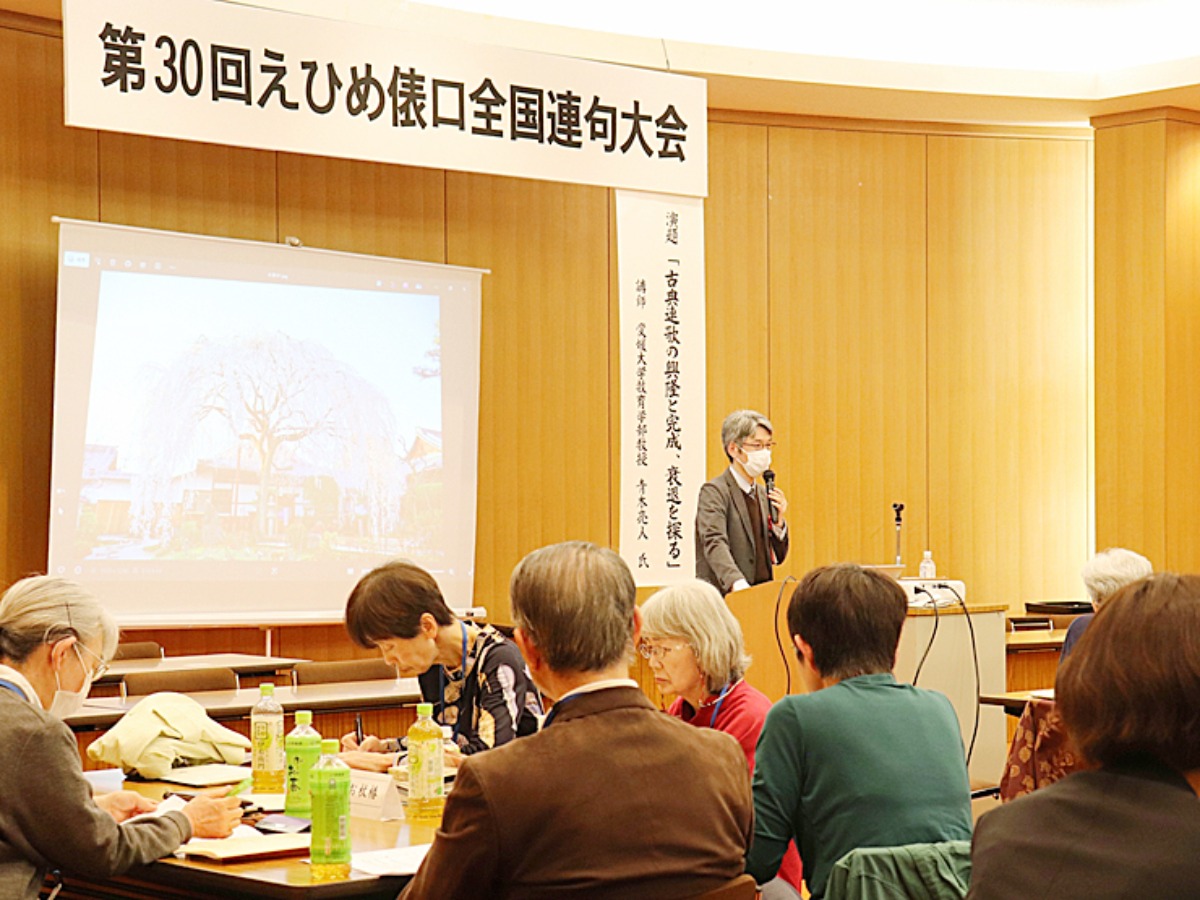 表彰式では、事前に全国から募集された連句作品から、後日作品集「俵口」へと掲載される受賞作が誕生!続く講演では、愛媛大学教育学部の青木亮人教授によって「古典連歌の興隆と完成、衰退を探る」という演題のお話がありました。