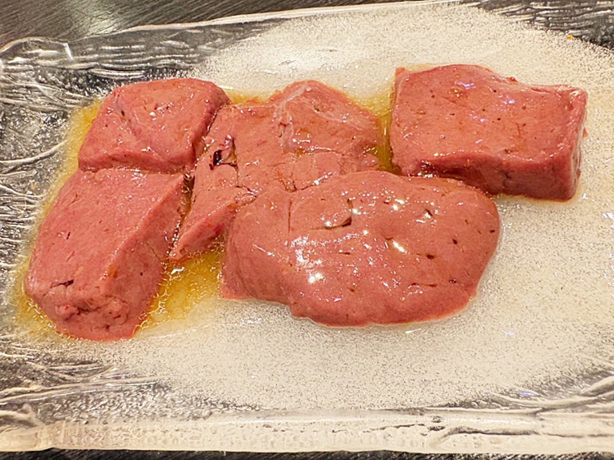 私の好物、鮮やかなピンク色のレバー。臭みも全然なく、焼いても縮まず歯応えがサクサクしていました。