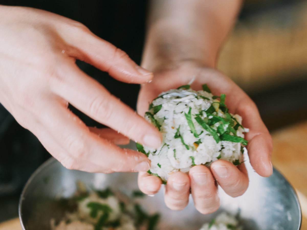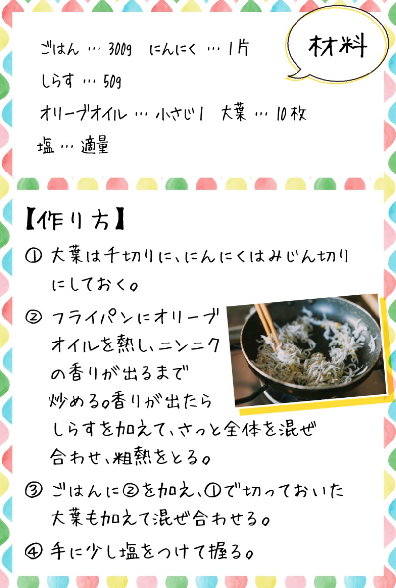 見た目は和風かと思いきや、食べるとペペロン風味!というギャップも楽しいおにぎり。大葉は多めに混ぜるのが美味しくなるポイントです。