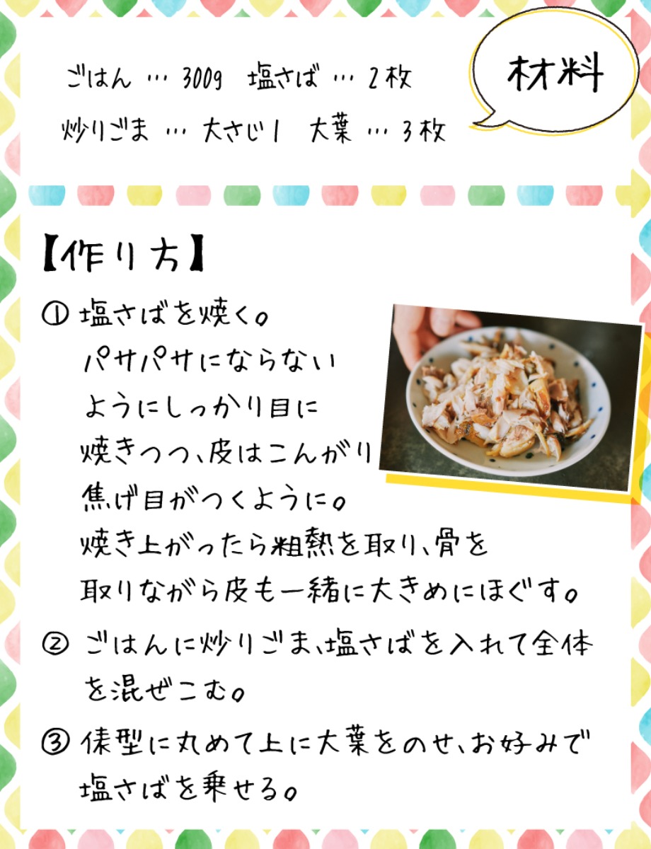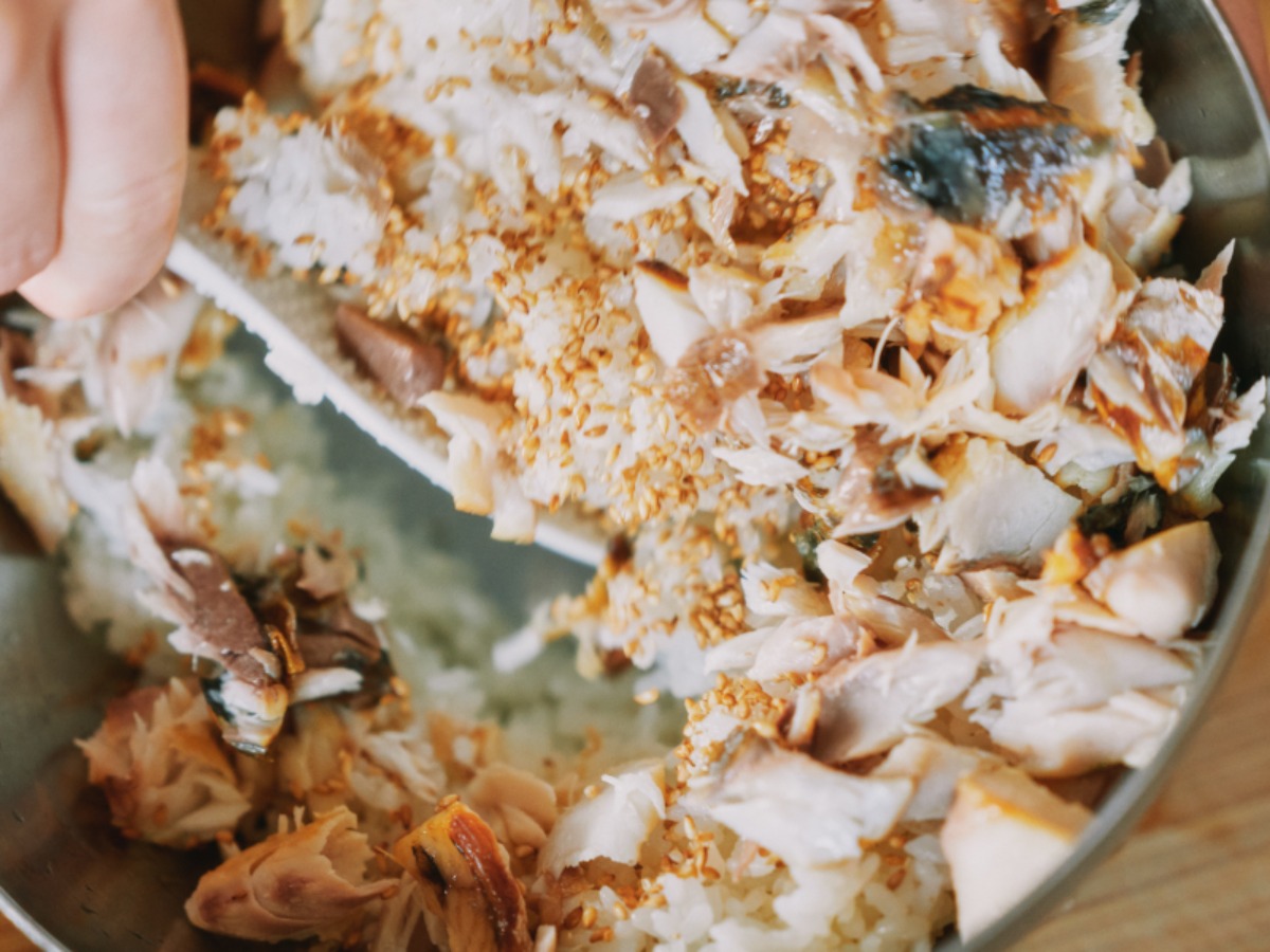 塩さばはほぐしすぎないほうが、ごちそう感も増して◎。皮ごと入れることで、炒りごまと合まって香ばしさがおいしさのひとつになります。塩さばの塩加減をみて、握るときに手に塩をつけてみてください。