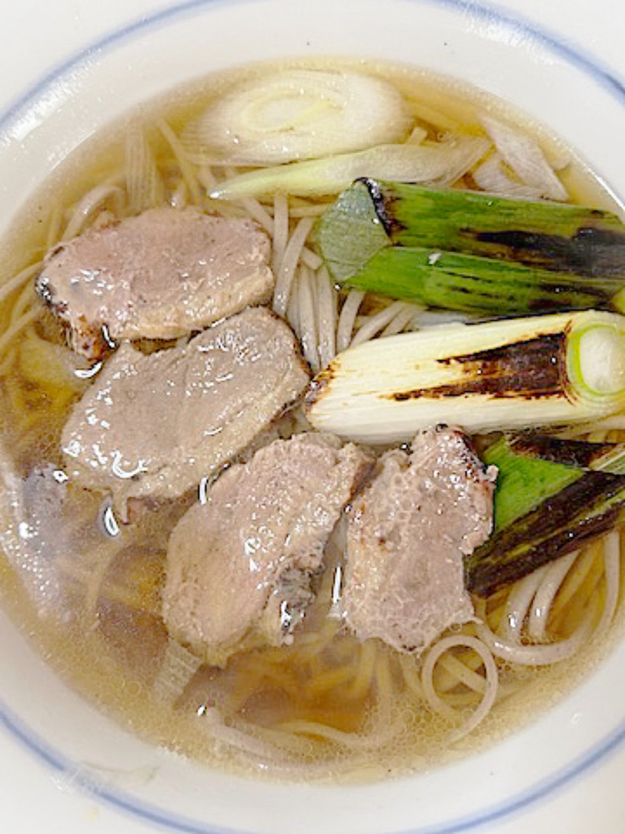 もう一つのおすすめが、こちらの「かも南蛮そば」です。香ばしい焼き目のついたネギと、旨味たっぷりの鴨肉がトッピングされており、優しいお出汁の香りが食欲をそそります。