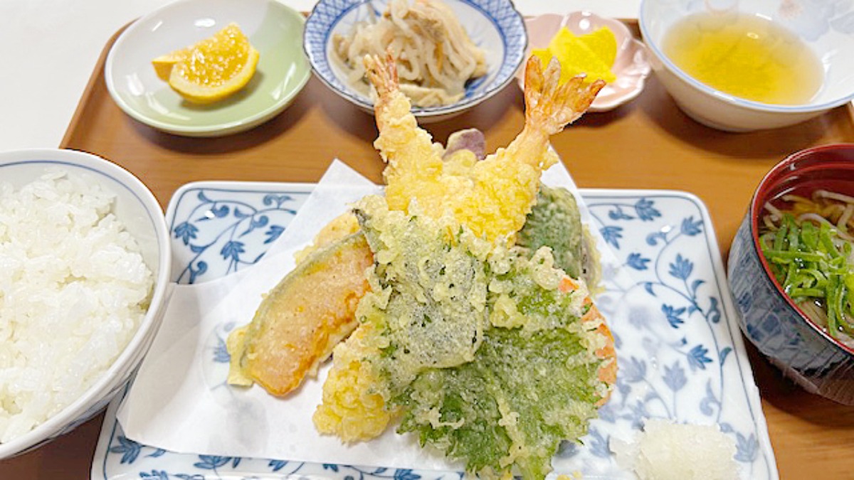 もっとお腹いっぱい食べたいという方には、エビ天や野菜天にご飯、小鉢などがセットになったボリューム満点の「天ぷら定食」もおすすめですよ。
