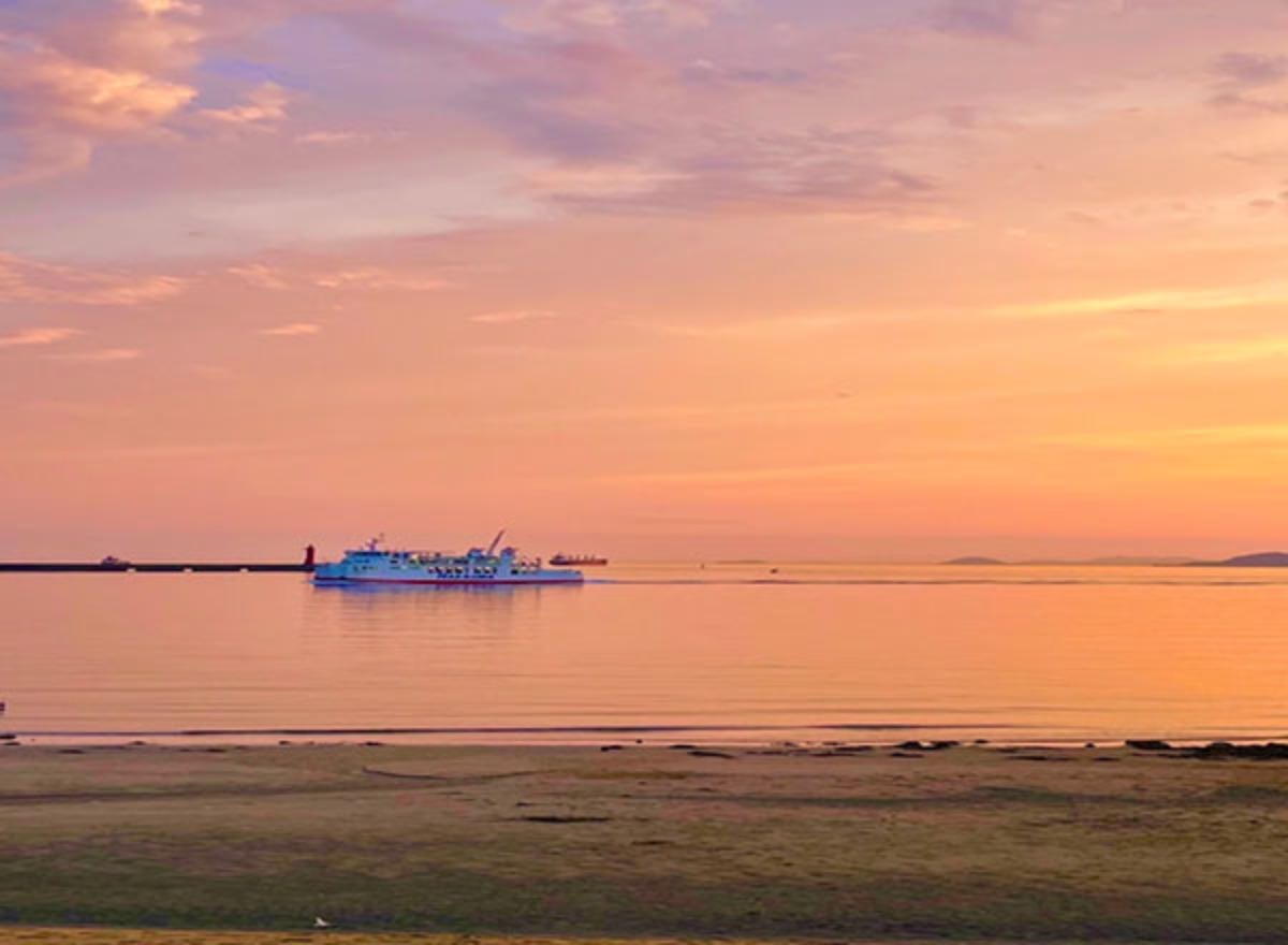 友人から見せてもらった鮮やかな夕焼けと海の写真。この写真は、愛媛県松山市にある梅津