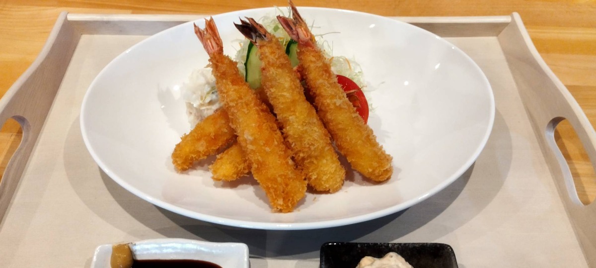 ランチで新登場の、新鮮で大きなエビを使用した「海老フライ定食」。プリプリの食感がたまらない。