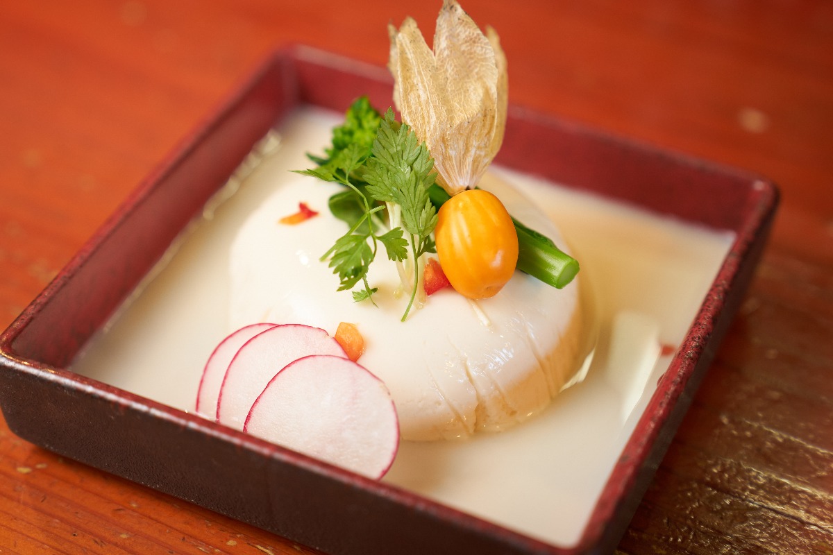 店の看板メニュー「自家製豆腐」は、共同農産の無添加豆乳と天然純正にがりを仕入れ、店内で手作り。ランチの「彩り籠御膳」でも自慢の豆腐や、季節の魚、野菜を使った小鉢をバランス良く味わえる。