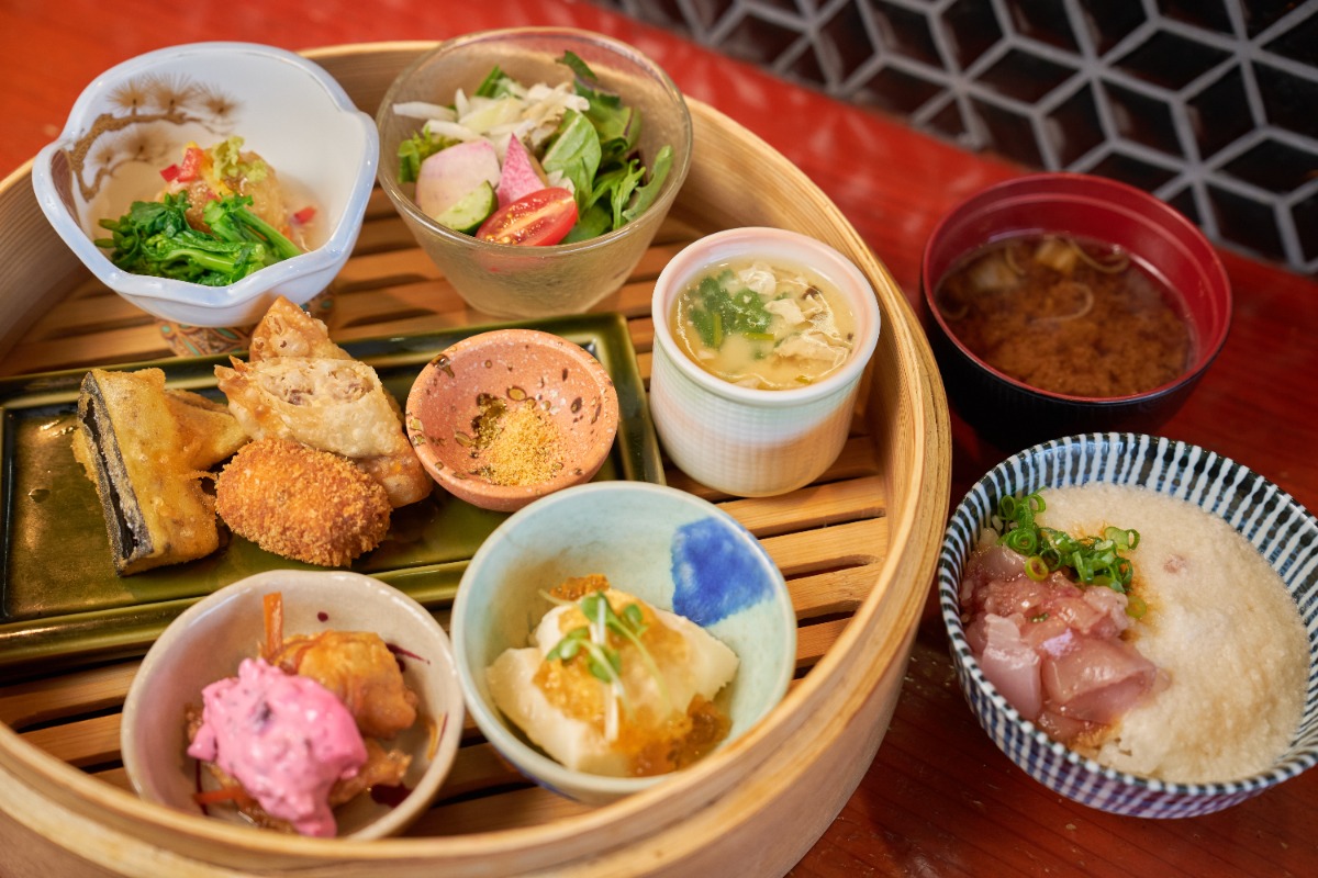創作小鉢、サラダ、豆乳茶碗蒸し、自家製豆腐、揚げ物など季節のおかずと、4種から選べる日替わりごはん、赤出汁が味わえる贅沢膳。