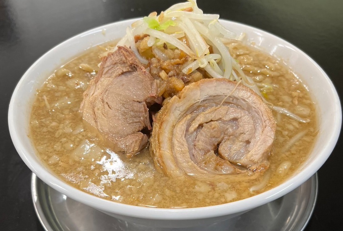 野菜と豚肉と豚背油がたっぷり入ったラーメンの店。こだわりの太ちぢれ麺を、昼は50から350gまで同じ価格で注文でき、夜は麺250g900円から50gごとに50円ずつアップする。豚の旨みを最大限に引き出した極上スープはとにかく濃い! 18時からは夜限定メニューや珍しい味の「豚骨塩ラーメン」も味わえる。