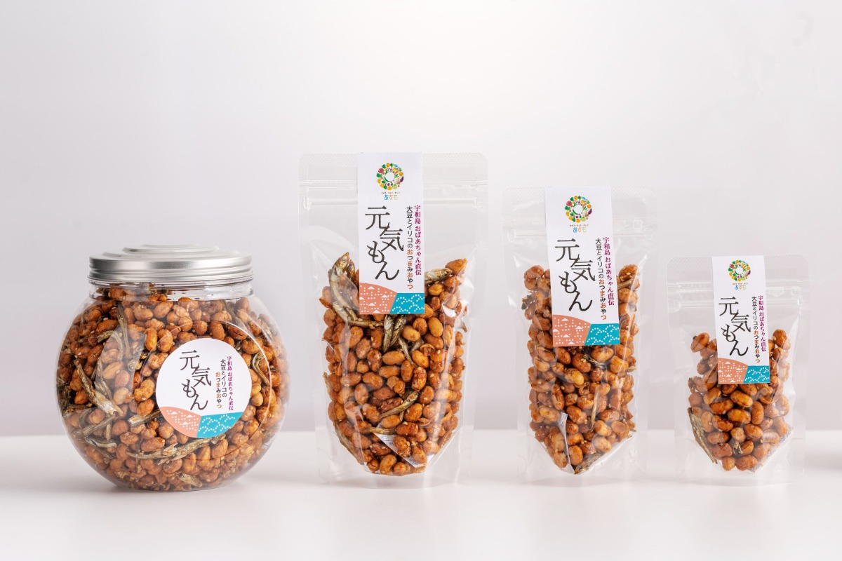 厳選された柑橘と宇和島産のパールパウダーを白あんでやさしく包み込み、急速冷凍した手作りのお菓子「真珠大福」が人気。また、宇和島市津島町産の大豆といりこをカラッと揚げ、醤油と砂糖でからめた、固くない豆菓子「元気もん」もおすすめ。お年寄りや子どもたちも食べやすい。