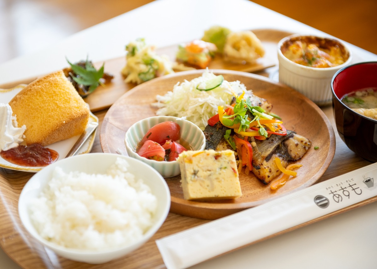 廃校した小学校に、農家を営む女性たちによる食堂がオープン。ふるさとの味が楽しめる日替わりランチは、肉か魚かを選べ、地元の素材を使用したたっぷり副菜、デザート、ドリンクが付いて1,200円。地元の古老直伝のお菓子も販売。