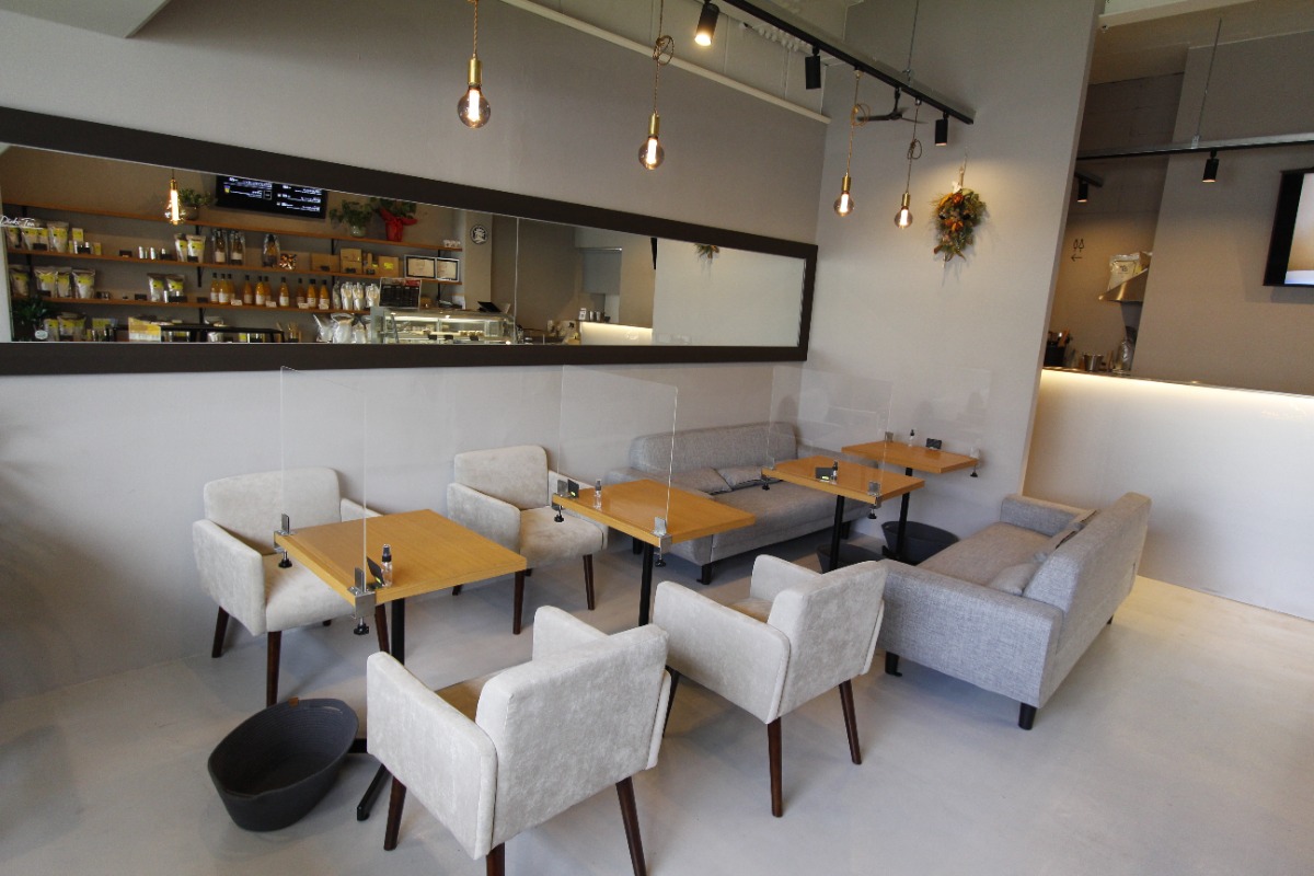 店内は、売り場横のテーブルに加えてカウンターがあり、1人でも利用しやすいのが嬉しい。人工芝を敷いている店の外にはテラス席があり、愛犬と一緒に利用することもできるので、散歩の寄り道にぴったり! もちろんテイクアウトも可能。