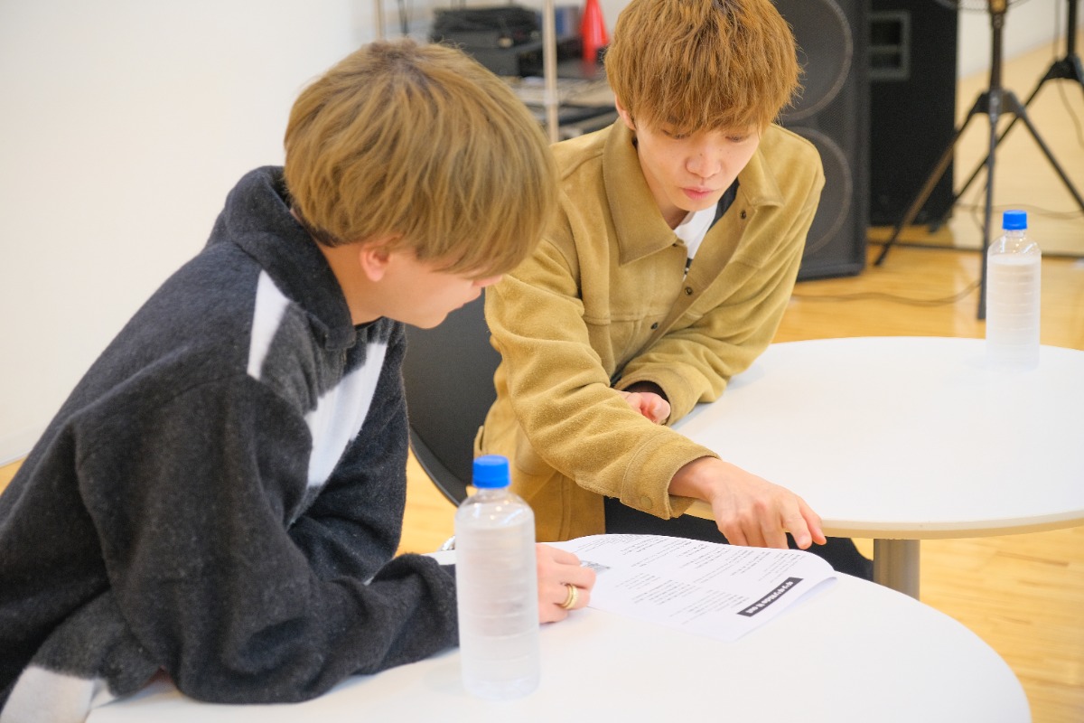 歌詞カードを見てお気に入りのフレーズを話す2人
