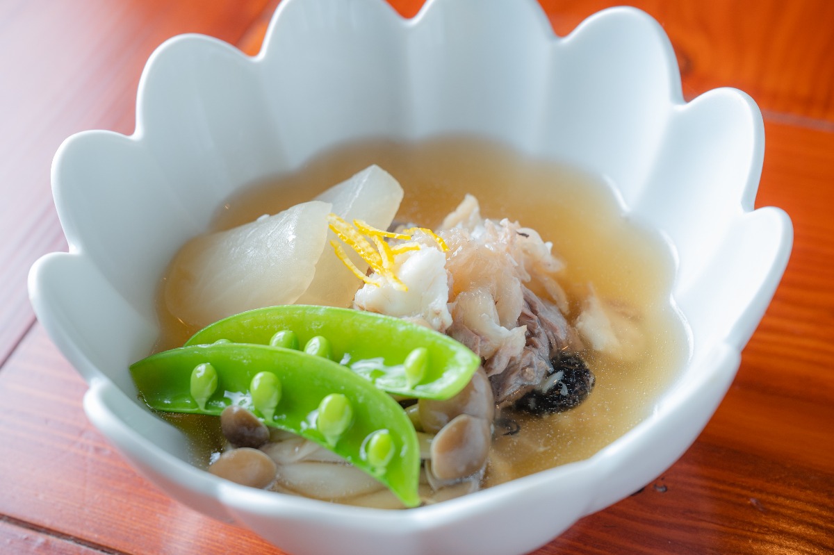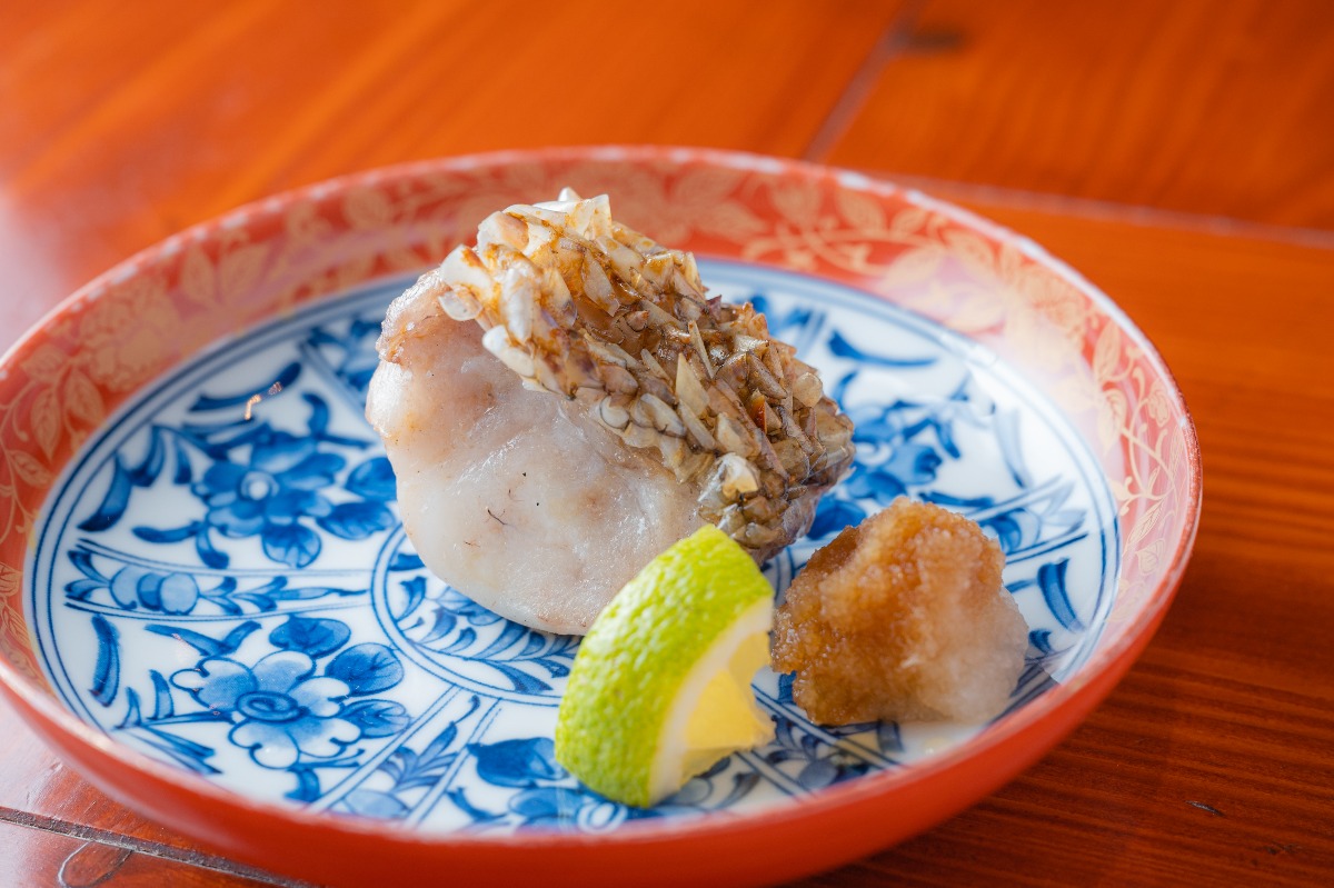 なかなか手に入らないシロアマダイをこの日は特別に仕入れて提供してくれた。「シロアマダイの松笠焼き」。パリパリに焼き上げた鱗ごといただく。※魚の種類はその日により異なる