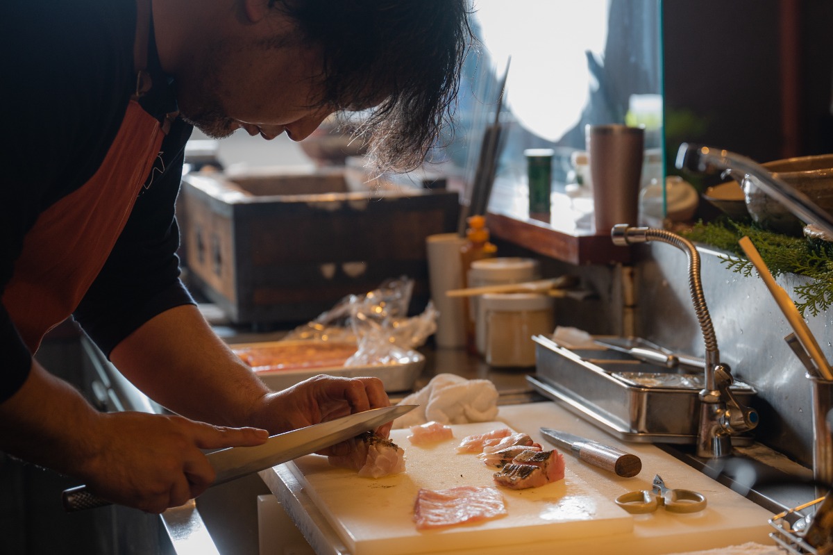 「僕は、いつも塩でいただきます」と、この日添えられたクエの鱗から作った自家製塩に、そっと刺身をつけていただく。