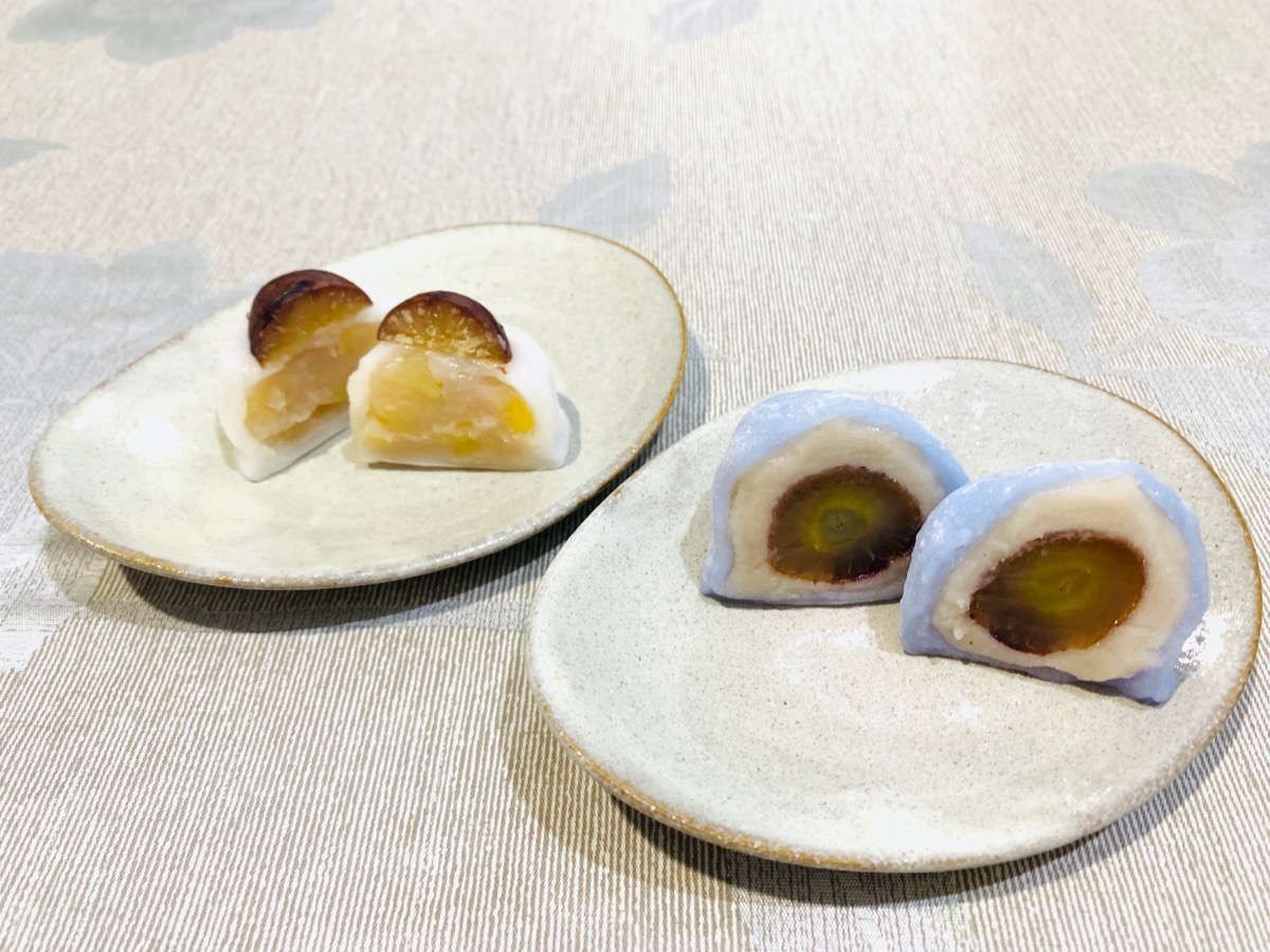 松山市桑原の和菓子屋さん。旬の果物を使ったフルーツ大福が特に人気のお店。ディスプレイには色とりどりの、コロンとまぁるく可愛い大福が並んでいます。今回いただいたブドウ大福、栗大福の断面の美しさに惚れ惚れ♡︎